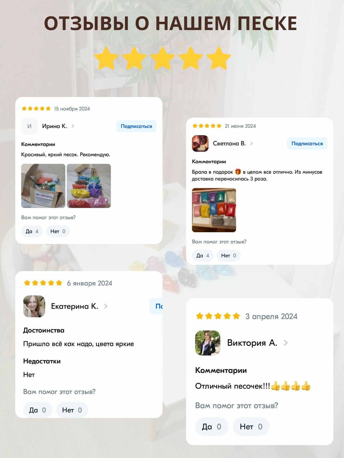 Ниже Вы можете прочитать отзывы на Цветной кварцевый песок для рисования и творчества, 10 ярких цветов, 1кг, ознакомится с подробными характеристиками, посмотреть интересные обзоры и фотографии на Цветной кварцевый песок для рисования и творчества, 10 ярких цветов, 1кг.