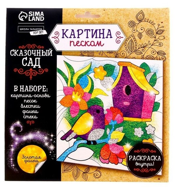 Набор для творчества. Фреска песком «Сказочный сад» + 9 цветов песка по 4 гр, блёстки, стека интересное: