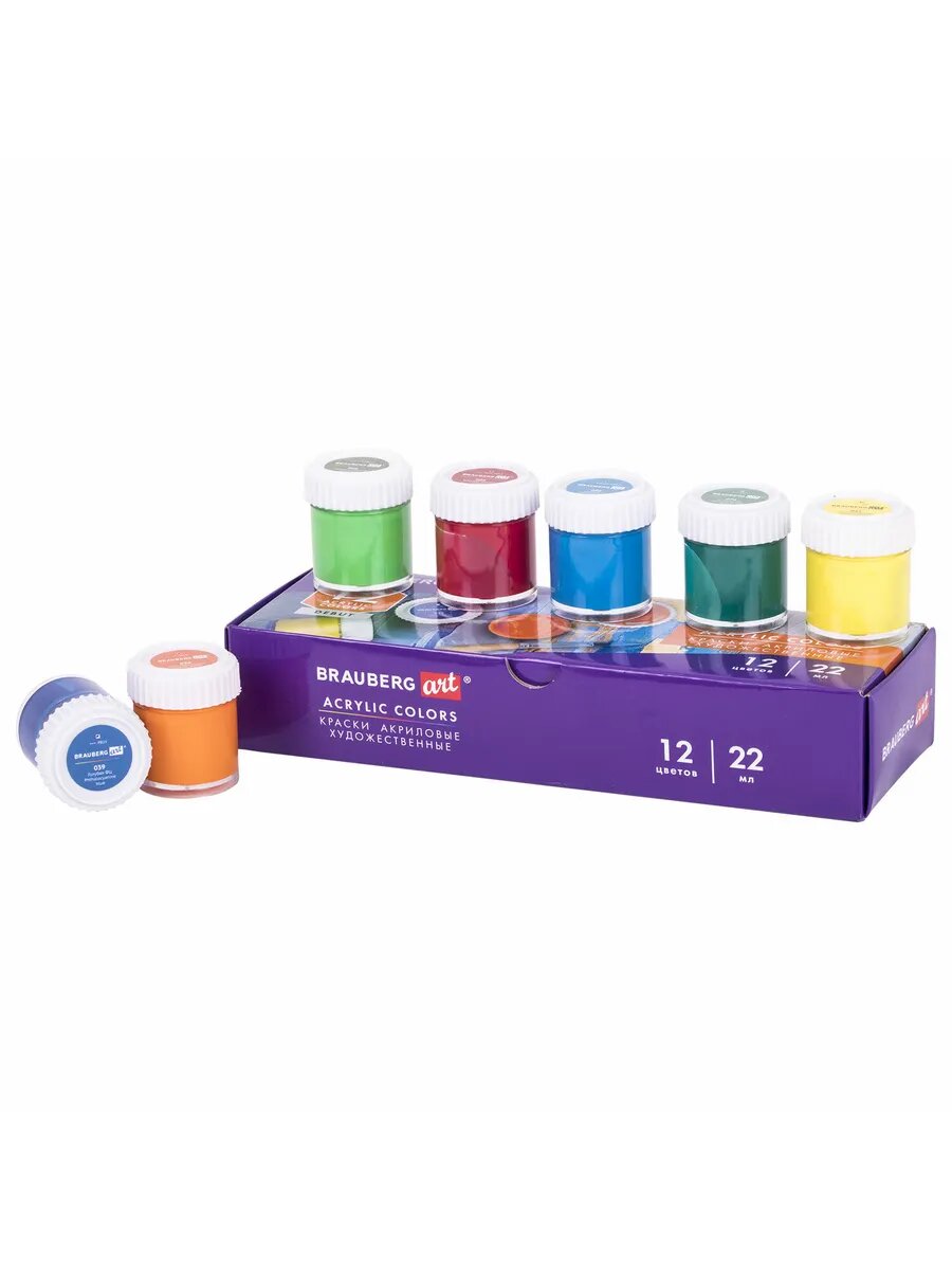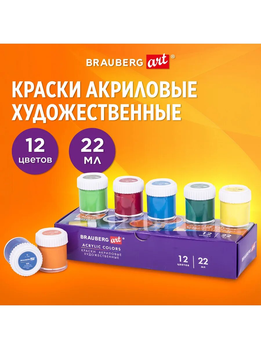 Краски акриловые художественные 12 цветов в банках по 22 мл, Brauberg Hobby, 192410