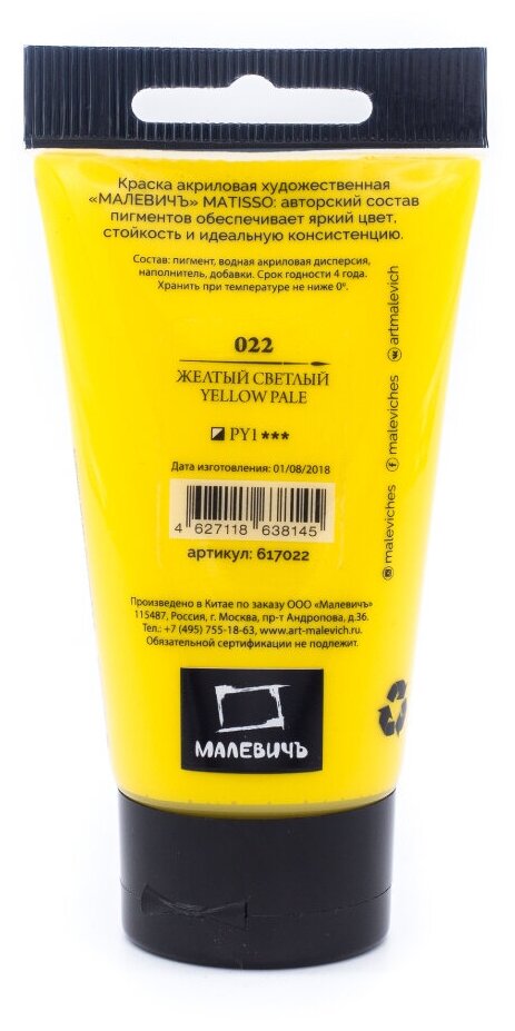 СохранитьАкриловая краска Малевичъ Matisso, желтый светлый, акрил глянцевый 60 мл интересное: