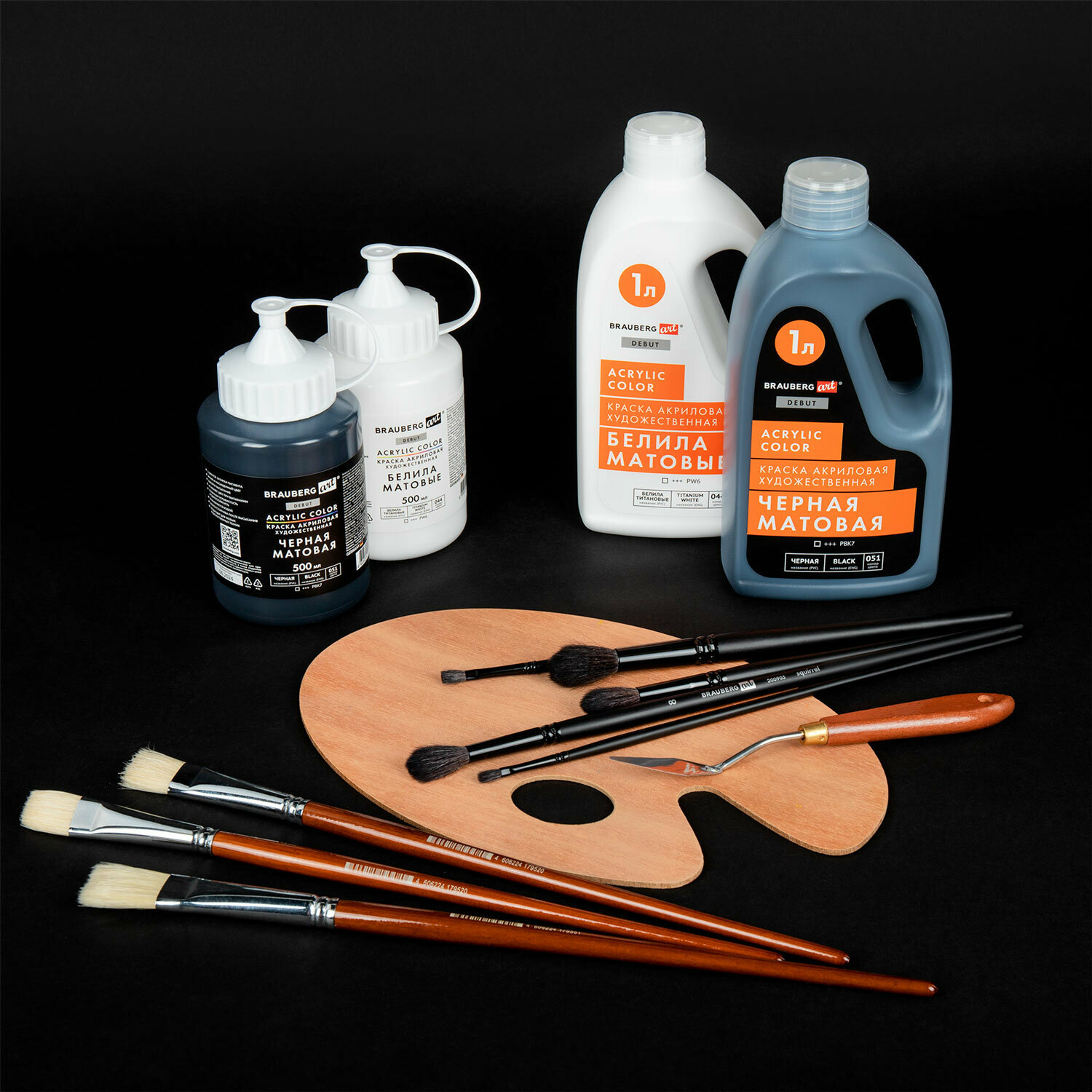 Акриловые краски художественные черные матовые, акрил для рисования по холсту, дереву 500 мл в банке, Brauberg Art Debut, 192536