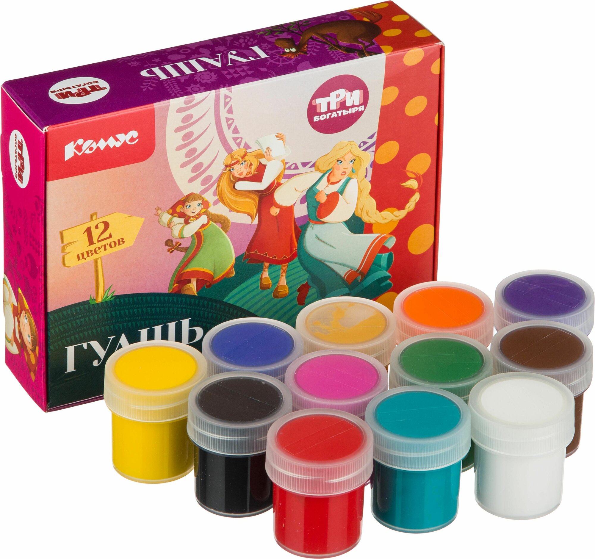 Купить Гуашь для рисования Комус Три богатыря, 12 цветов, 20 мл