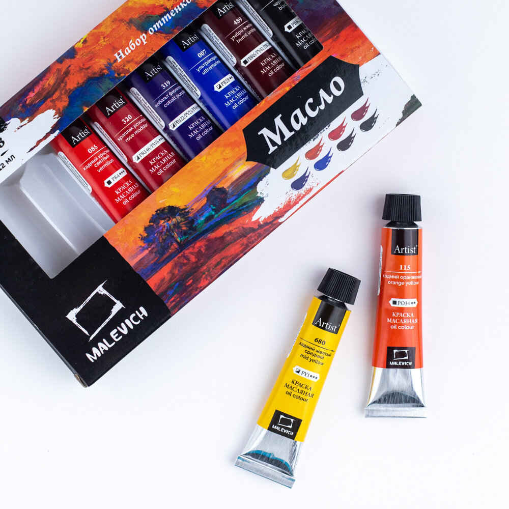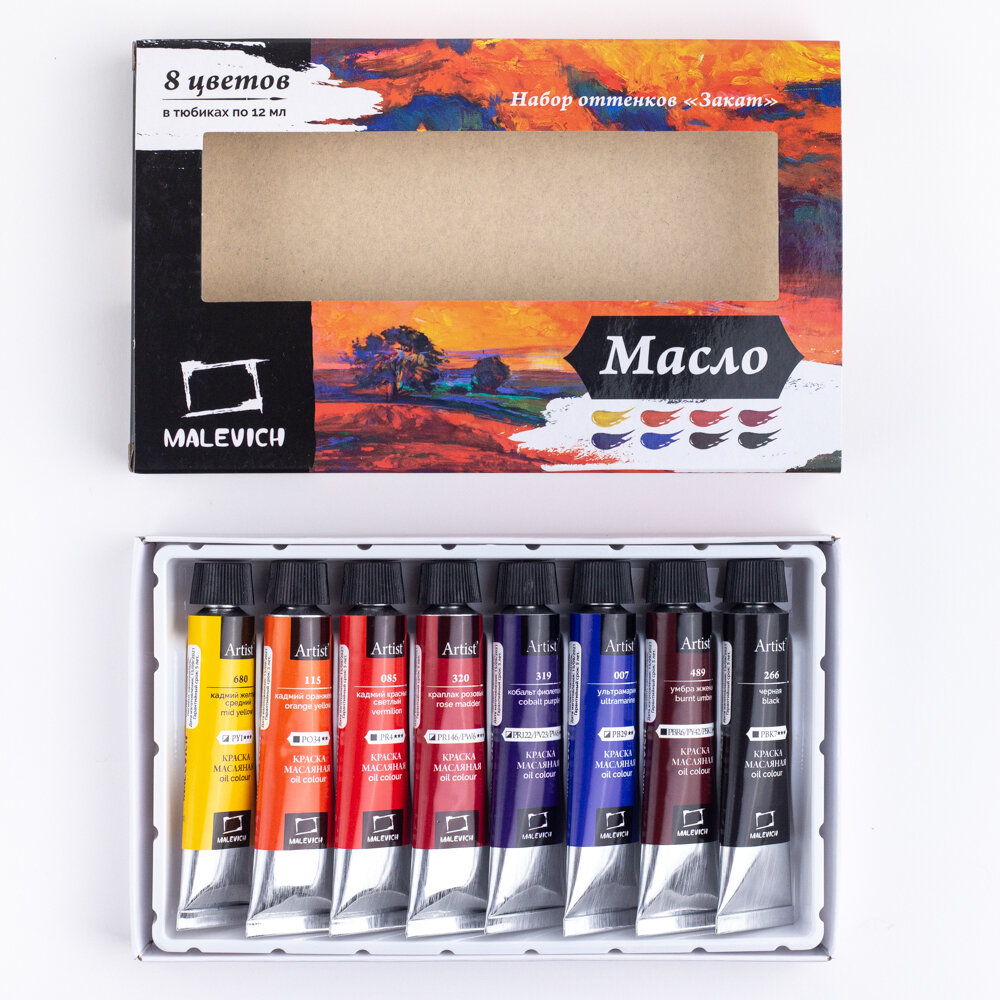 Набор масляных красок Малевичъ, закат, художественное масло 8 цветов по 12мл интересное: