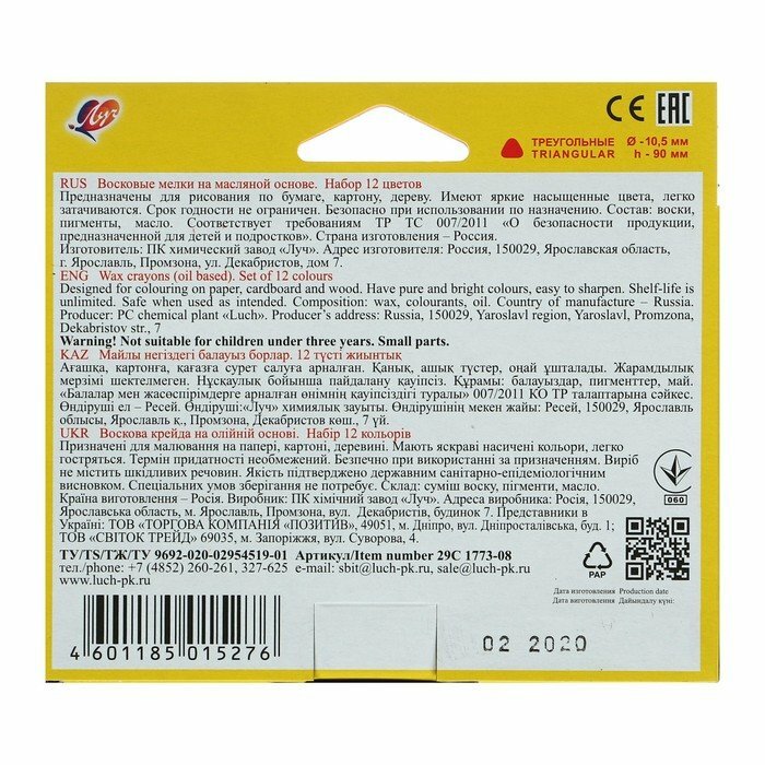 Мелки восковые на масляной основе Луч Кроха (треугольн.)12 цв,29С 1773-08 интересное: