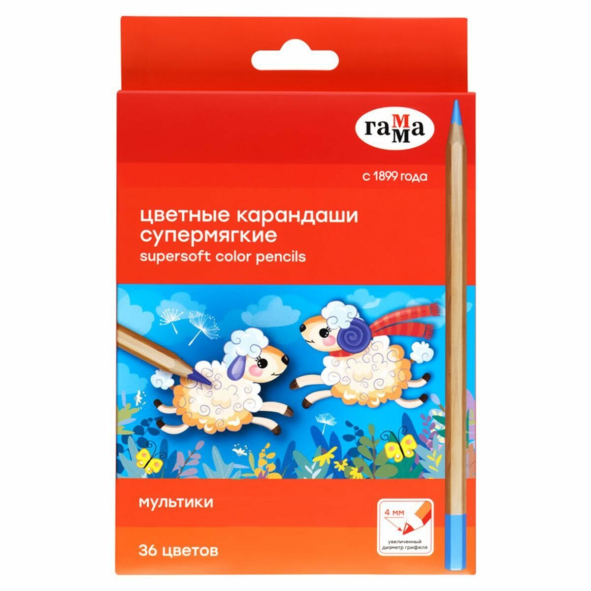 Купить Карандаши цветные Гамма "Мультики", 36цв, супермягкие, увелич. диаметр грифеля 4,0мм, заточен, картон. упак, европодвес