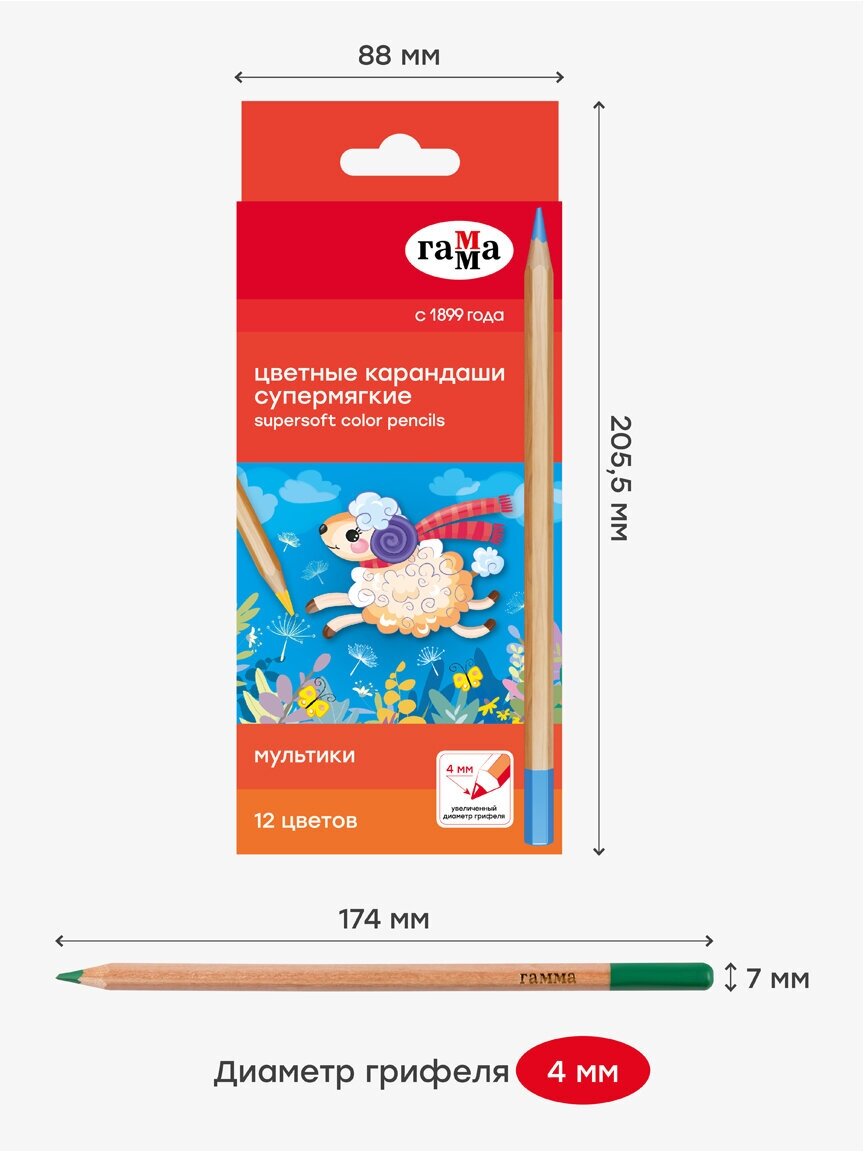 Карандаши цветные Гамма "Мультики" 12 цветов, супермягкие, увелич. диаметр грифеля 4,0мм, заточенный, европодвес, 1 упаковка интересное: