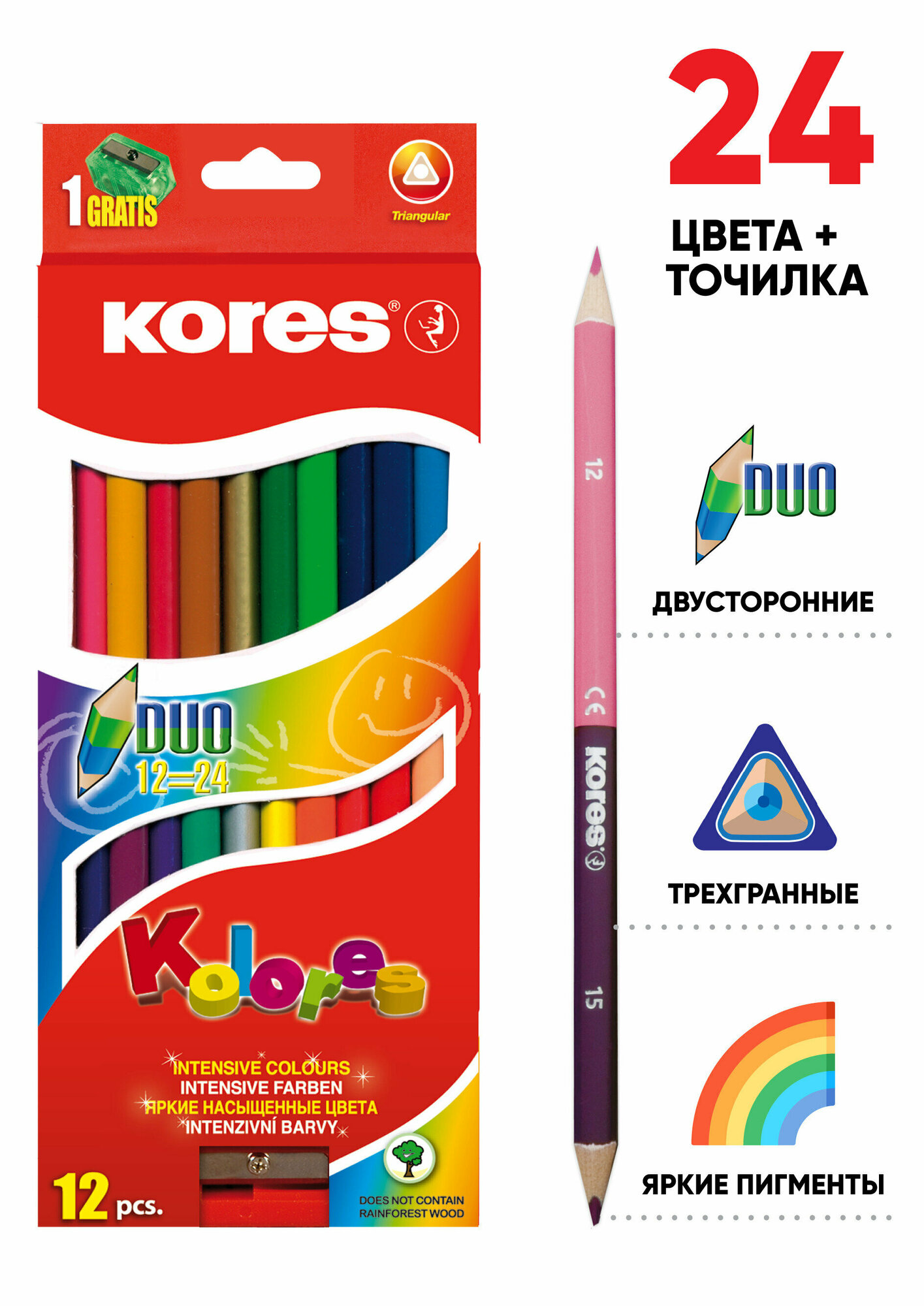 Купить Карандаши цветные Kores, трехгранные, толщина грифеля 3 мм, набор 24 цвета, с точилкой