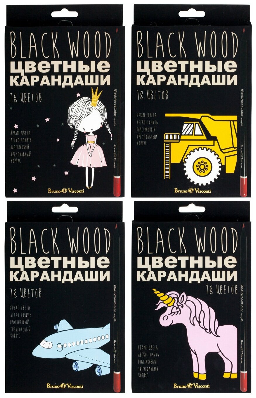 Карандаши BrunoVisconti, цветные, 18 цветов, 4 вида , BlackWoodColor, Арт. 30-0098, упаковка в ассортименте интересное: