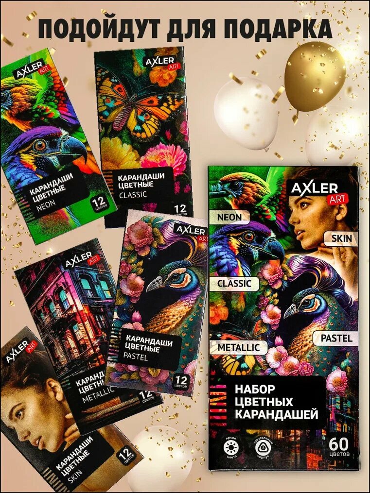 Купить Карандаши цветные AXLER Art для рисования, мягкие профессиональные, набор 60 шт: классические, пастельные, неоновые, телесные, металлик