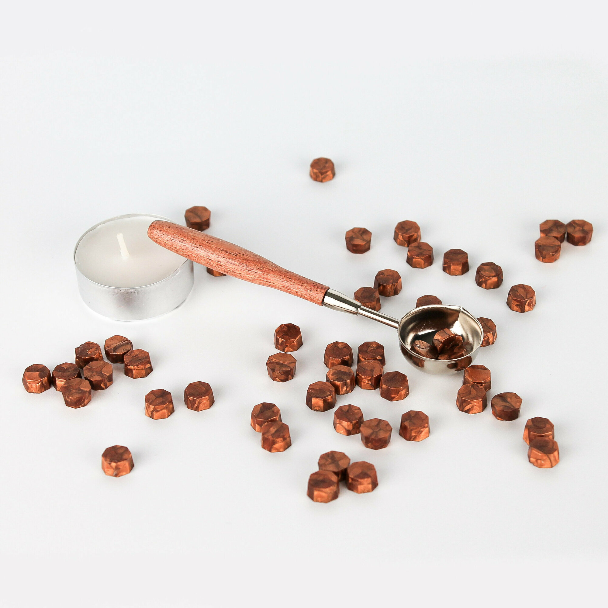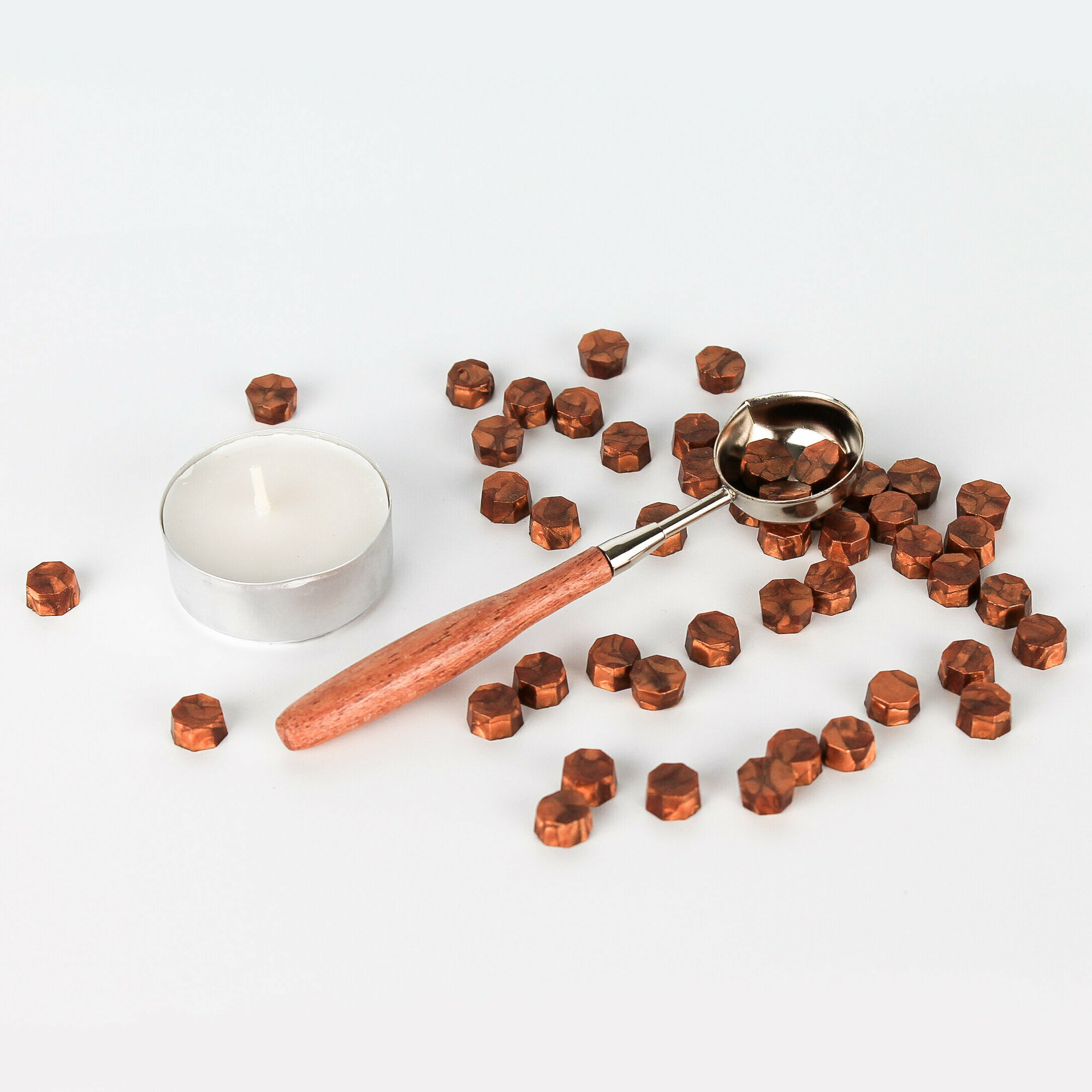 Купить Сургуч в гранулах бронзового цвета с ложкой для плавления и свечой, набор: ложечка с деревянной ручкой, сургуч, свеча