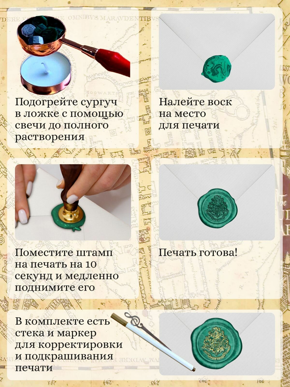 Набор для создания сургучных печатей Хогвартс с воском, инструментами, значком по мотивам Гарри Поттер