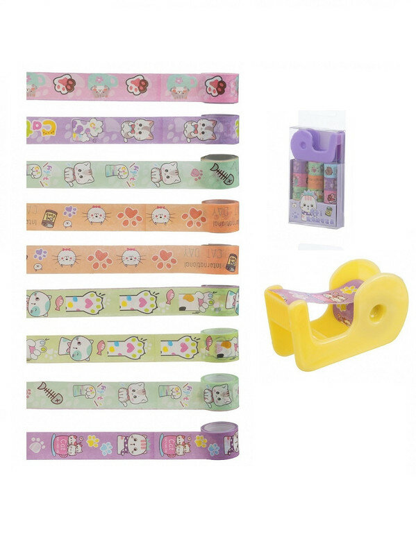 Набор Клейкая лента декоративная Кошки Лапки бумажная 9 лент + диспенсер желтый