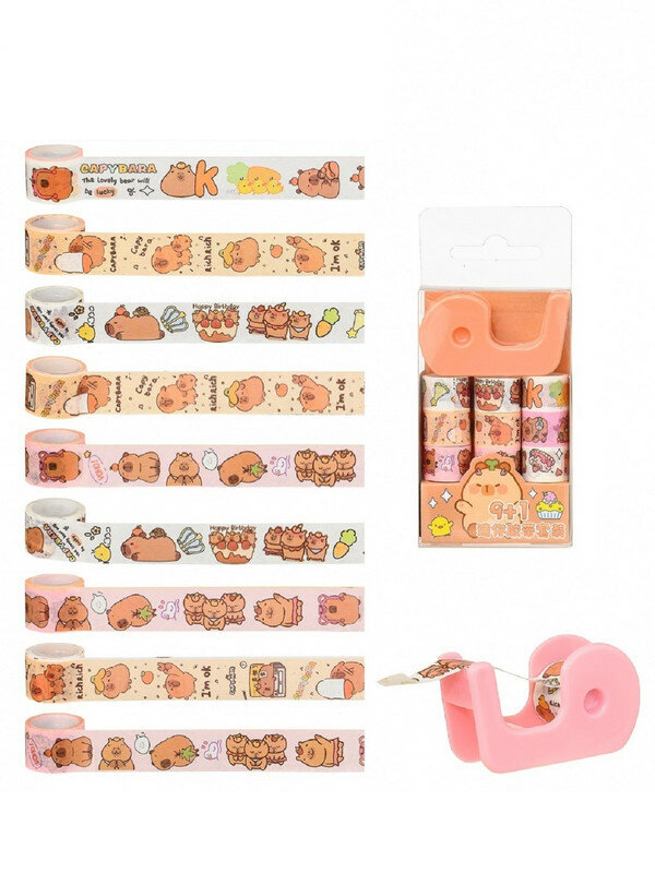 Набор Клейкая лента декоративная капибара бумажная 9 лент + диспенсер розовый