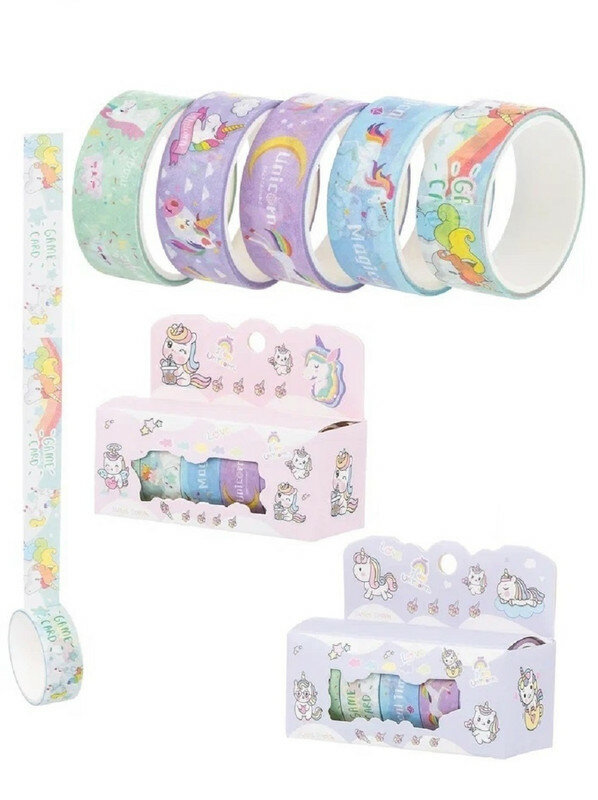 Набор Клейкая лента декоративная Единорог бумажная 5 лент розовая Е627
