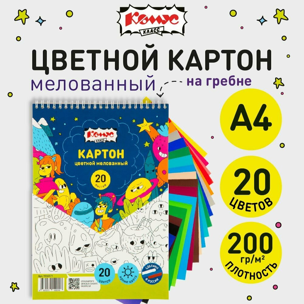 Купить Картон цветной А4 Комус Класс, 20 листов, 20 цветов, мелованный , односторонний
