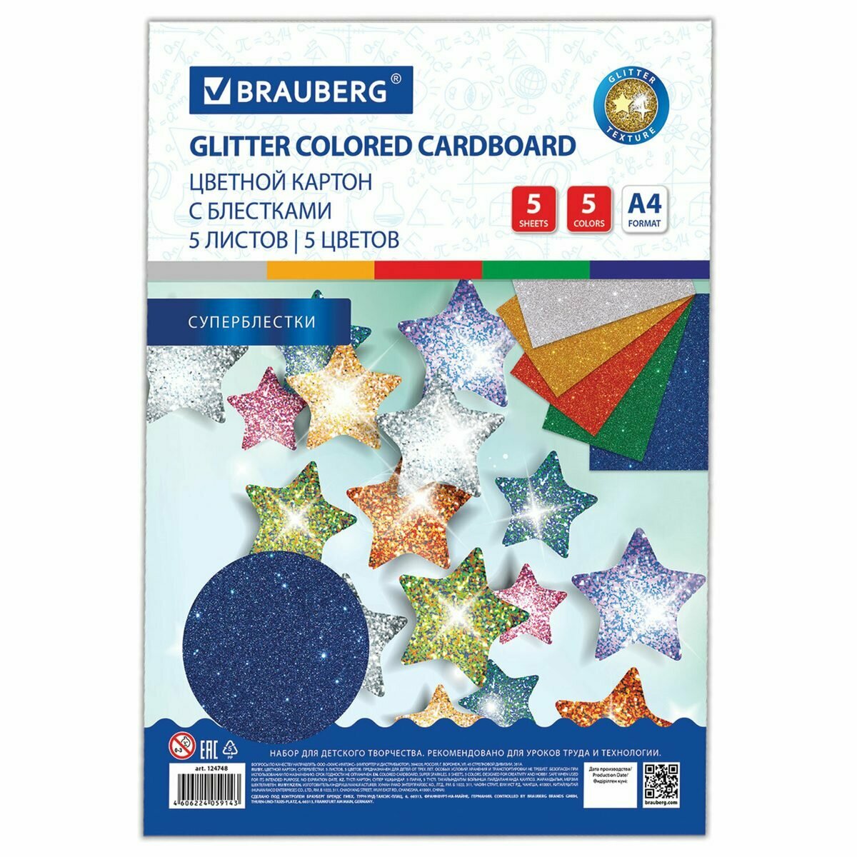Купить Картон цветной немелованный Brauberg (5 листов, 5 цветов, А4, блестки, 210х297мм) (124748), 50 уп.
