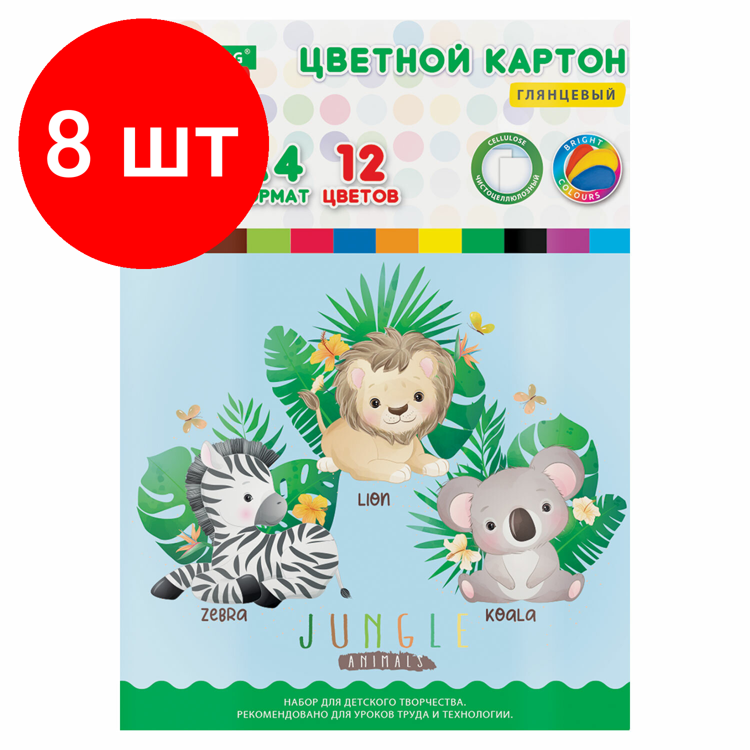 Купить Комплект 8 шт, Картон цветной А4 мелованный EXTRA, 24 листа 12 цветов, в папке, BRAUBERG KIDS, 200х290, Джунгли, 115158