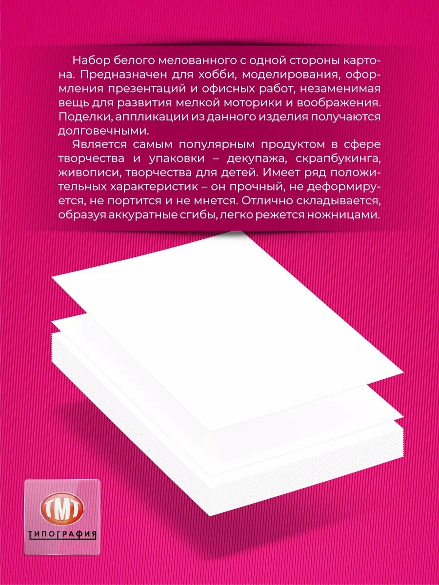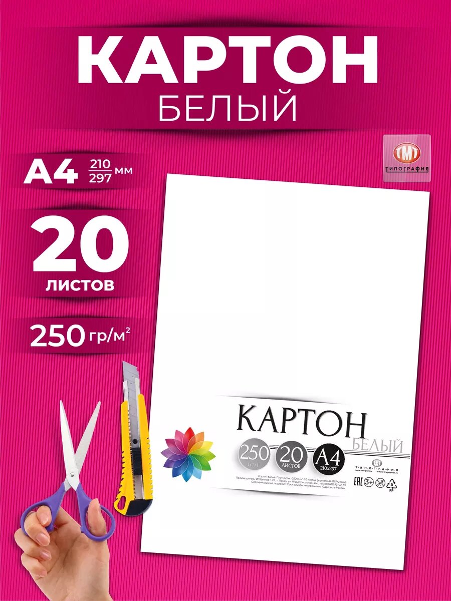 Белый картон для школы от бренда Типография "ТМТ", набор из 20 листов, формат А4, матовый интересное: