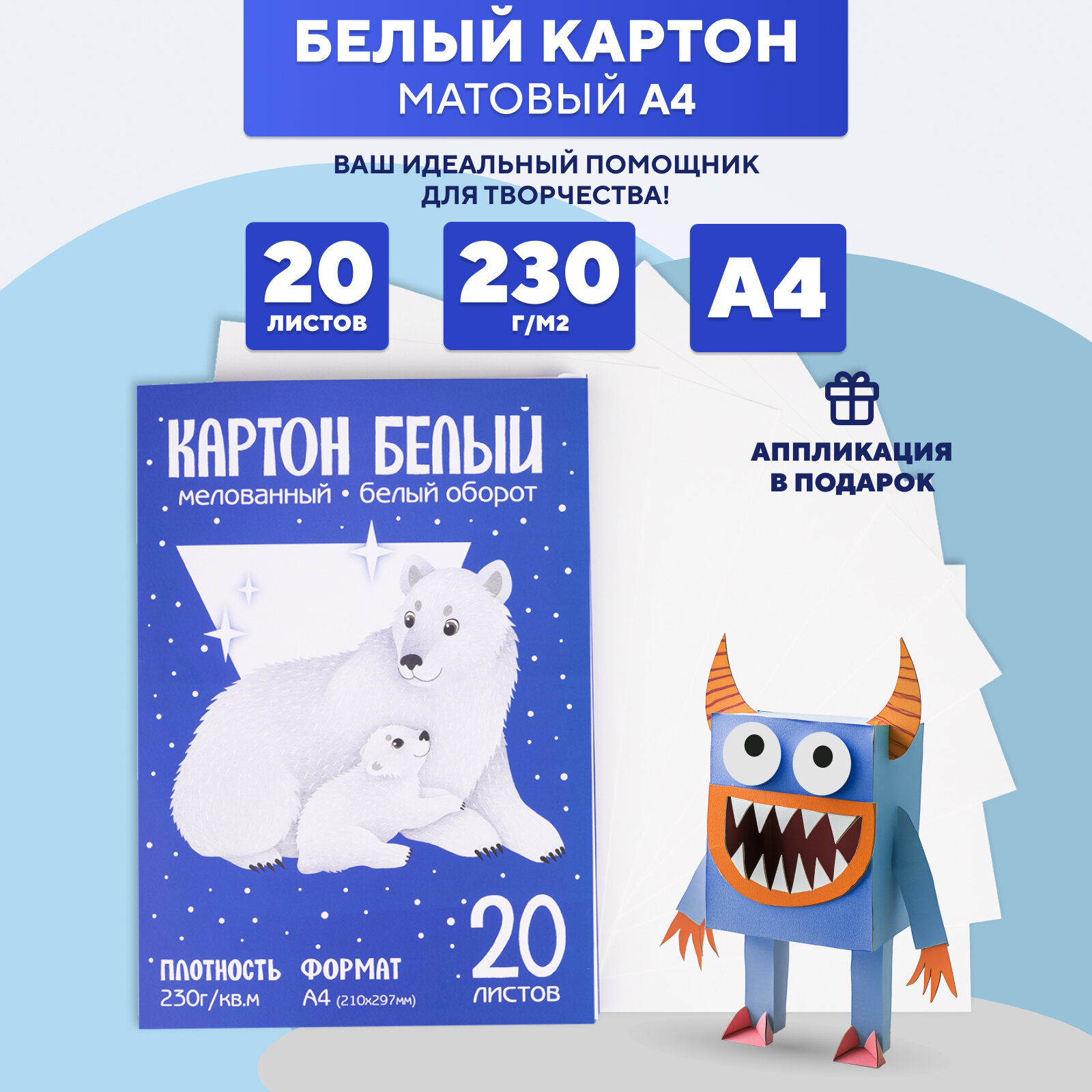 Купить Картон белый для школы и хобби RUMBA, мелованный, 230г, А4, 20 листов
