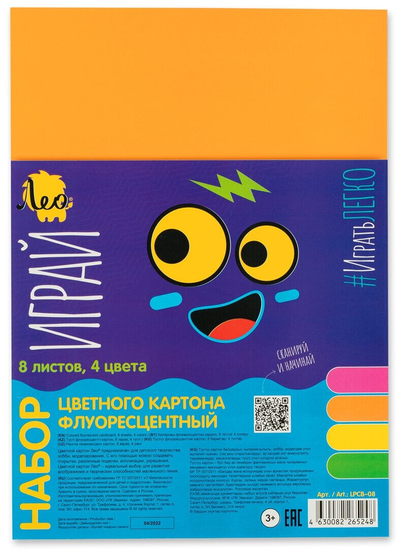 "Лео" "Играй" Картон цветной флуоресцентный LPCB-08 20 х 28.3 см 8 л. 4 цв. . интересное: