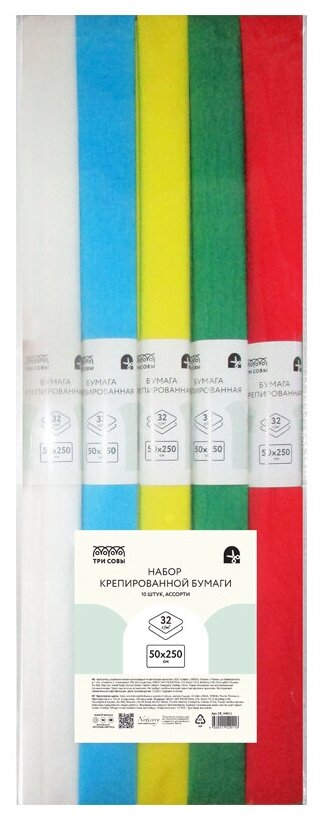 Набор крепированной бумаги ТРИ совы, 50*250см, 32г/м2, 10шт, ассорти, в рулонах интересное: