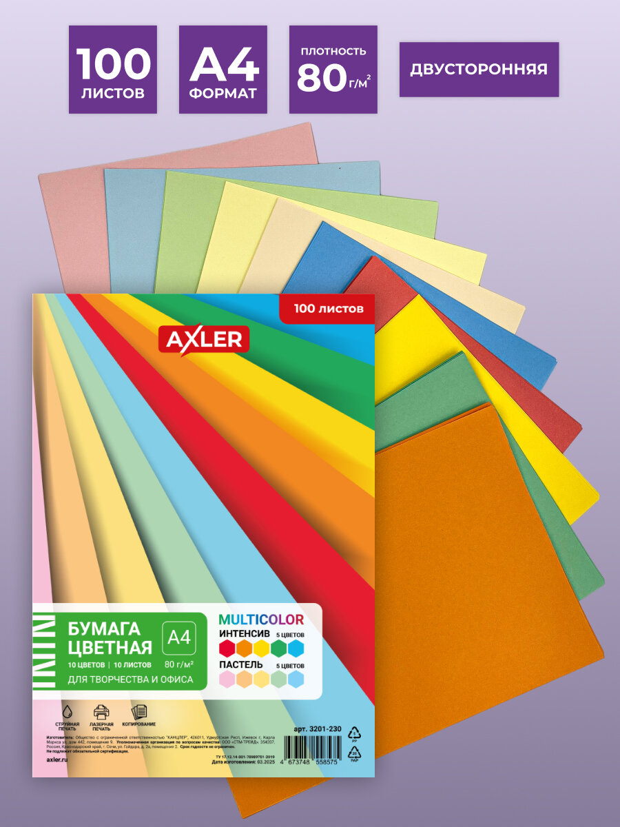 Купить Цветная бумага двухсторонняя А4 AХLER, для школы и принтера, набор 100 листов (10 цветов x 10 листов)