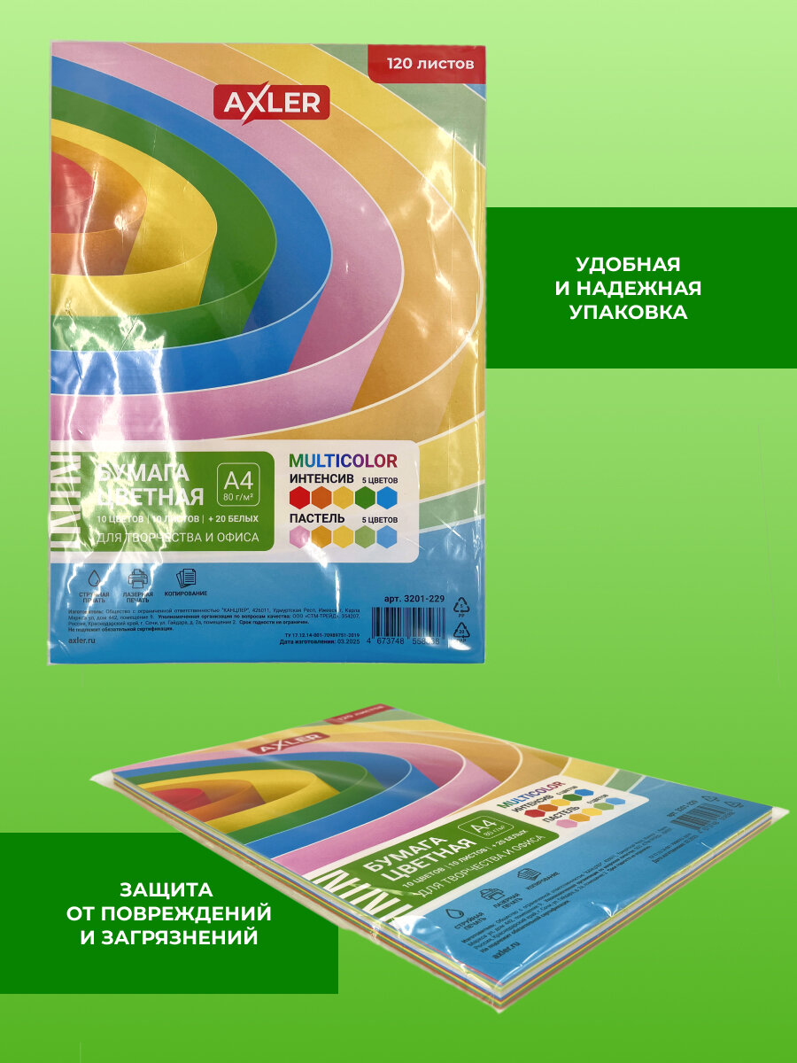 Ниже Вы можете прочитать отзывы на Цветная бумага двухсторонняя А4 AХLER, для школы и принтера, набор 120 листов (10 цветов x 10 листов + 20 белых), ознакомится с подробными характеристиками, посмотреть интересные обзоры и фотографии на Цветная бумага двухсторонняя А4 AХLER, для школы и принтера, набор 120 листов (10 цветов x 10 листов + 20 белых).