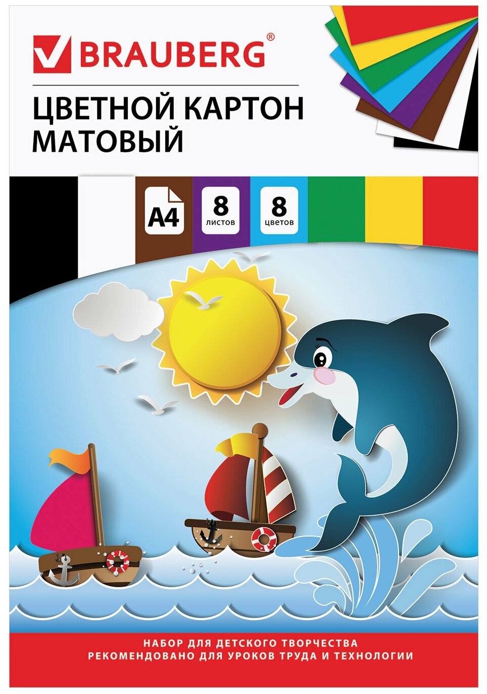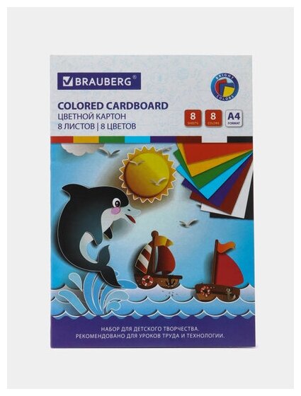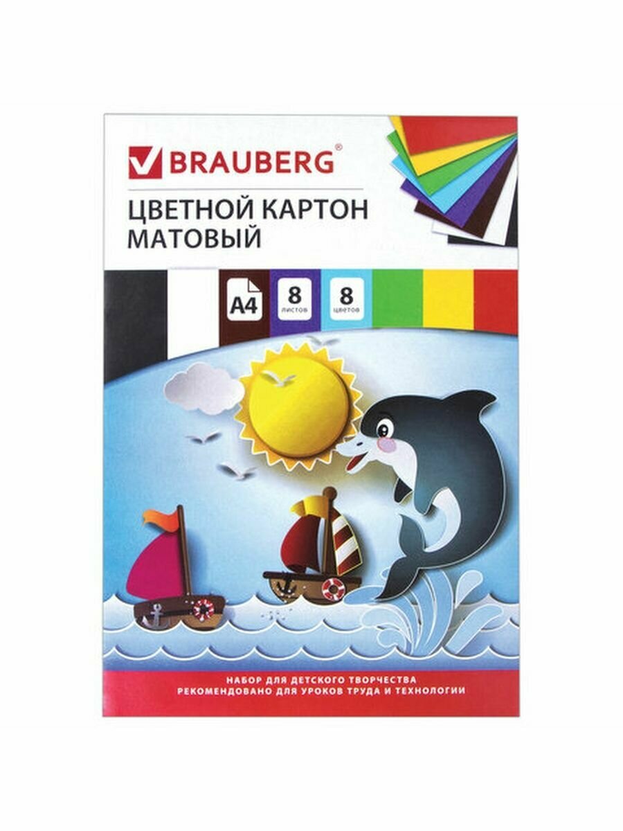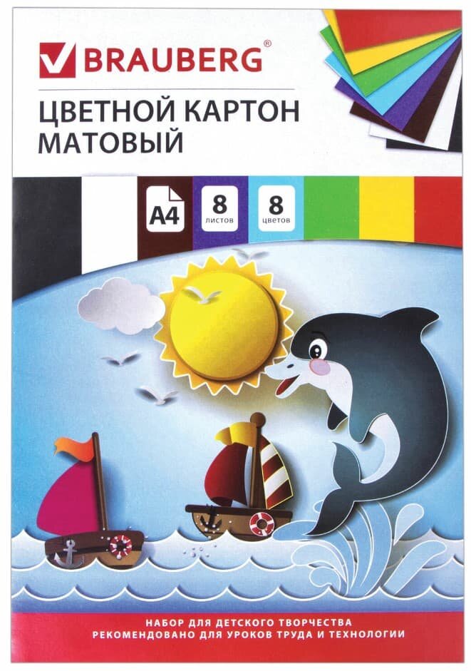 Картон цветной А4 немелованный (матовый), 8 листов 8 цветов, в папке, BRAUBERG, 200х290 мм, "Дельфин", 129909 интересное: