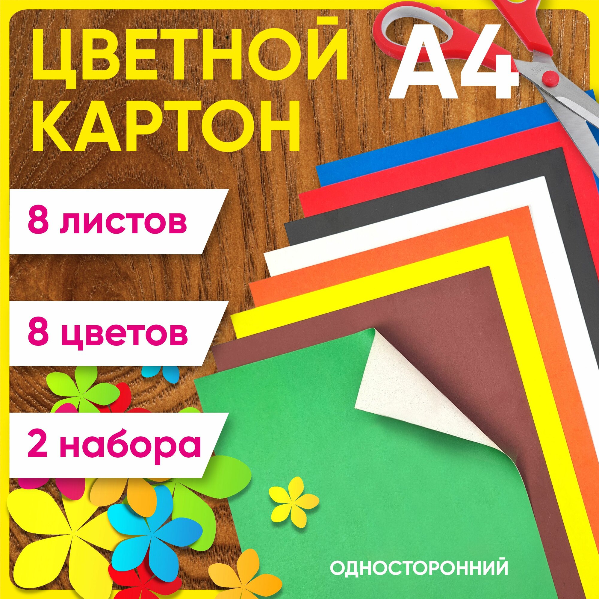 Картон цветной А4 немелованный, односторонний, 220 г/м2, 8 цветов, 8 листов