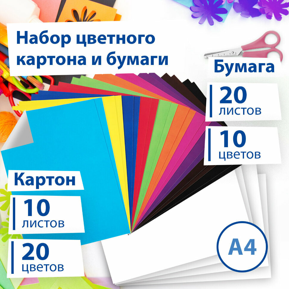 Набор картона и бумаги A4 мелованные (белый 10 л, цветной и бумага по 20 л,10 цветов), BRAUBERG интересное: