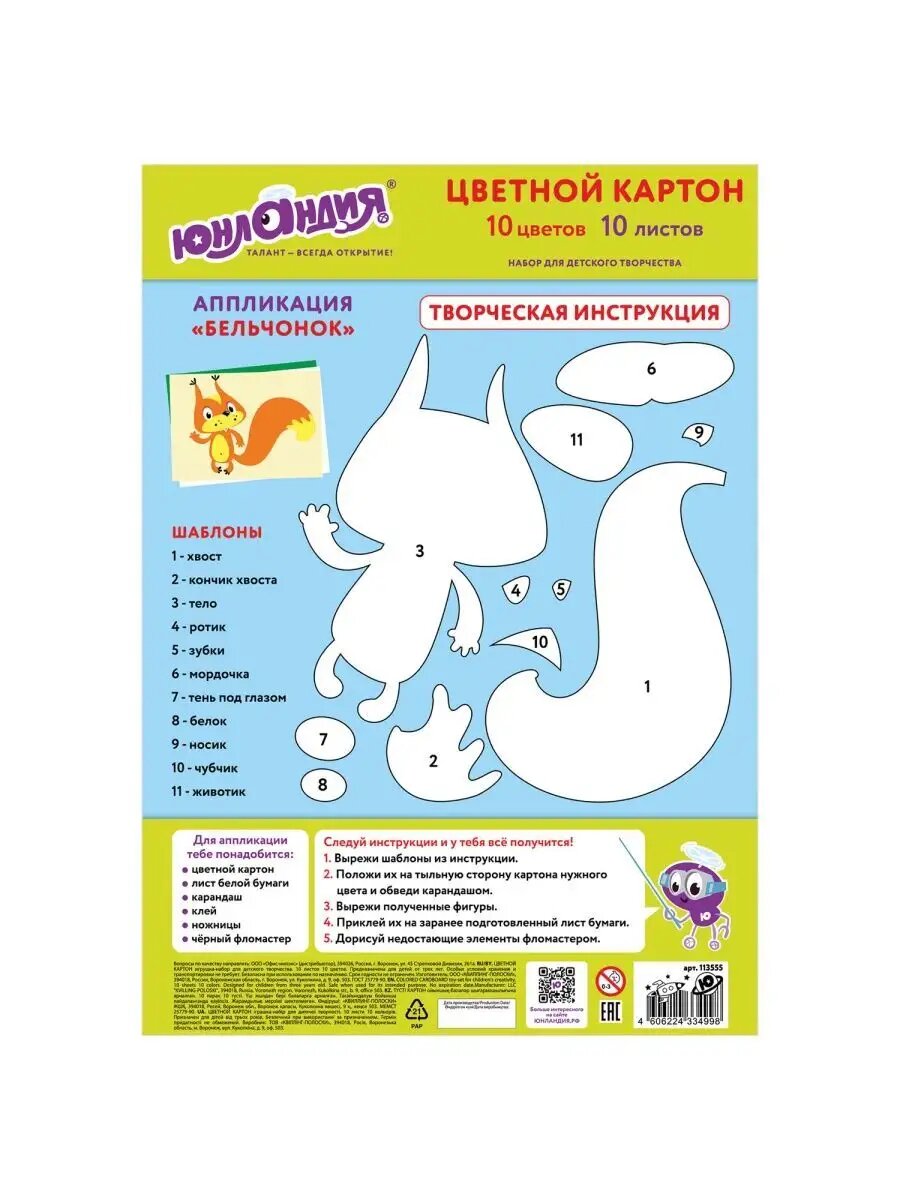 Цветной картон Юнландия "Бельчонок", для творчества, формат A4, 10 цветов, 10 листов интересное:
