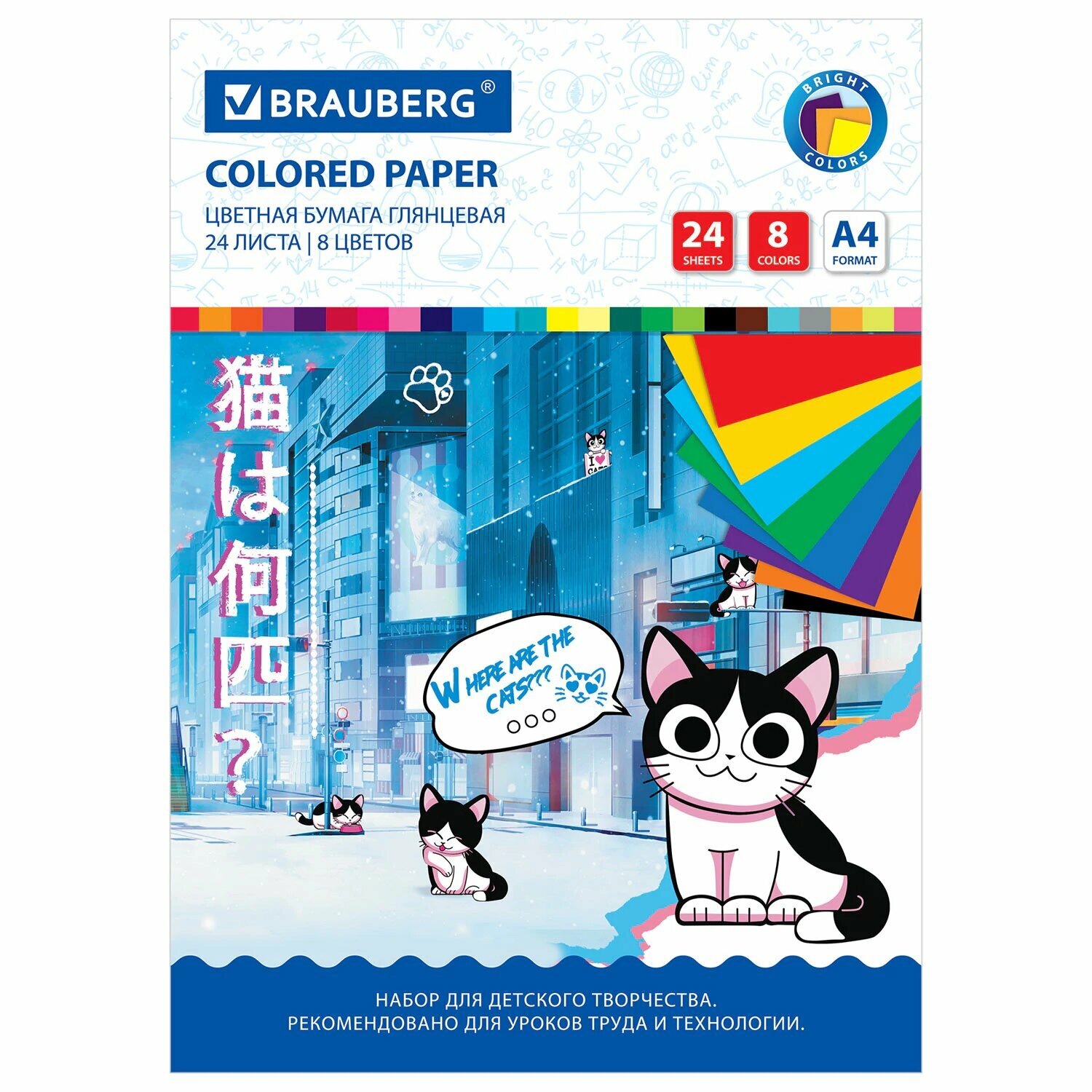 Купить Цветная бумага А4 набор 24 листа 8 цветов для школы односторонняя, для детского творчества, скрапбукинга, оригами и аппликаций, Brauberg, 115487
