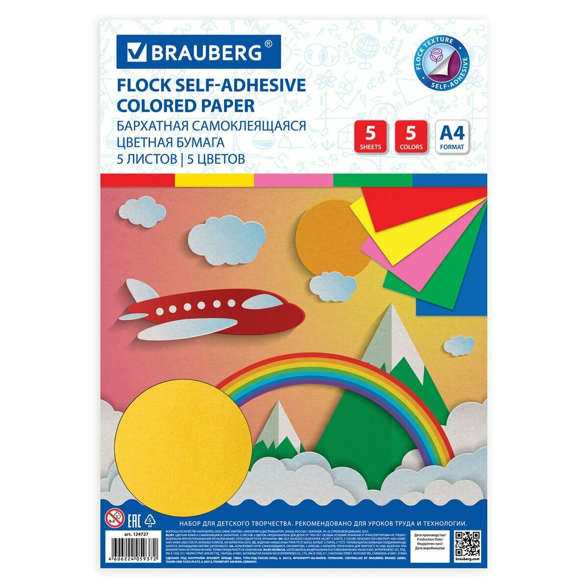 Купить Бумага цветная бархатная самоклеящаяся Brauberg (5 листов, 5 цветов, А4) (124727), 50 уп.