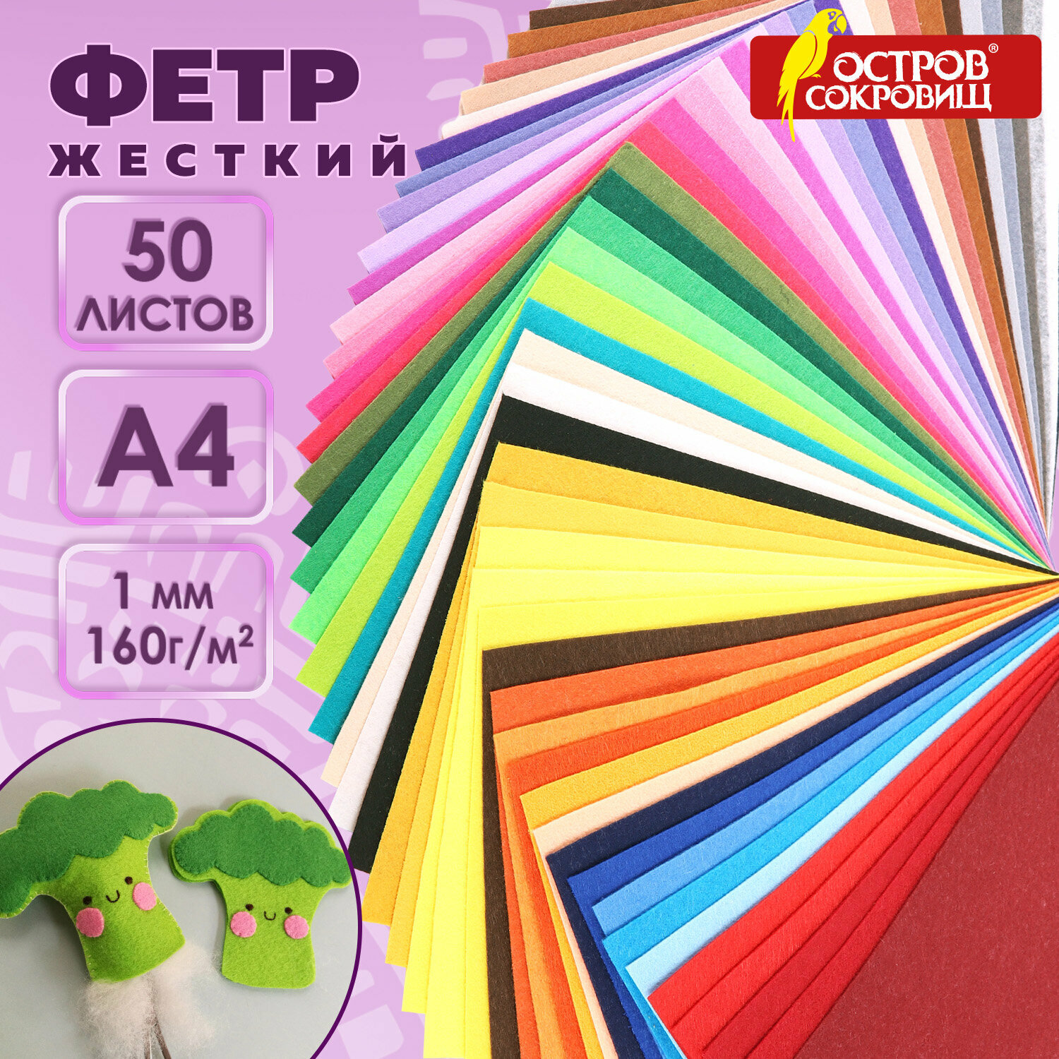 Цветной фетр А4, 1 мм, 50 л, 50 цветов, плотность 160 г/м2, остров сокровищ, 665477 интересное: