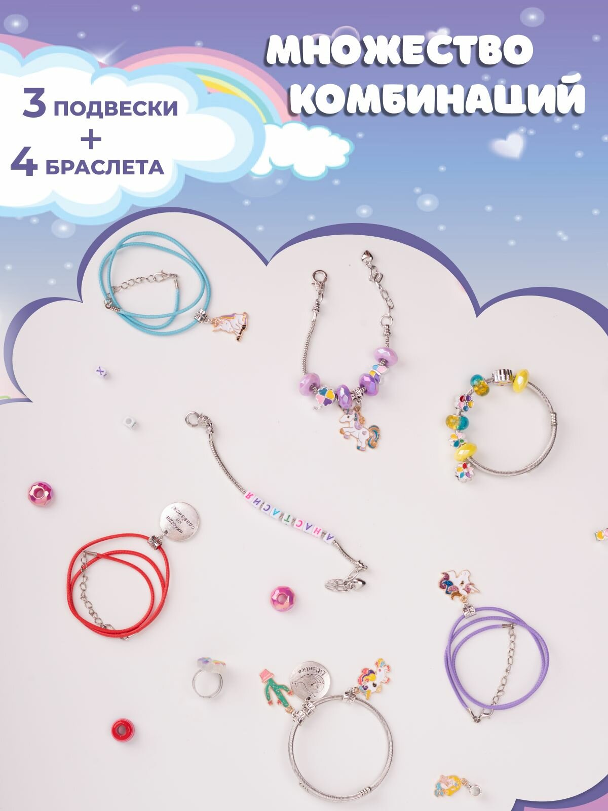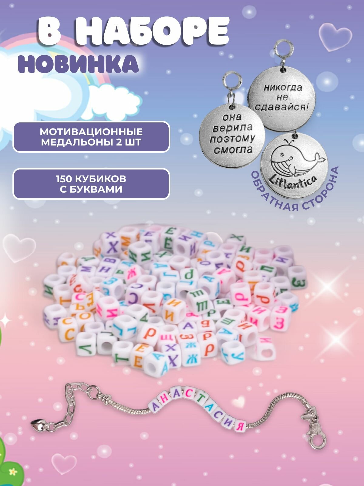 Набор для создания украшений, цвета радуги, 227 предметов (подарочный пакет, открытка, бусины с буквами, шармы, подвески). Новогодний подарочный набор для детей Litlantica Литлантика