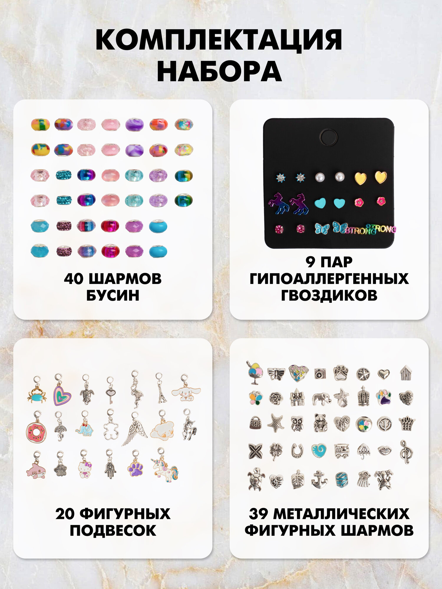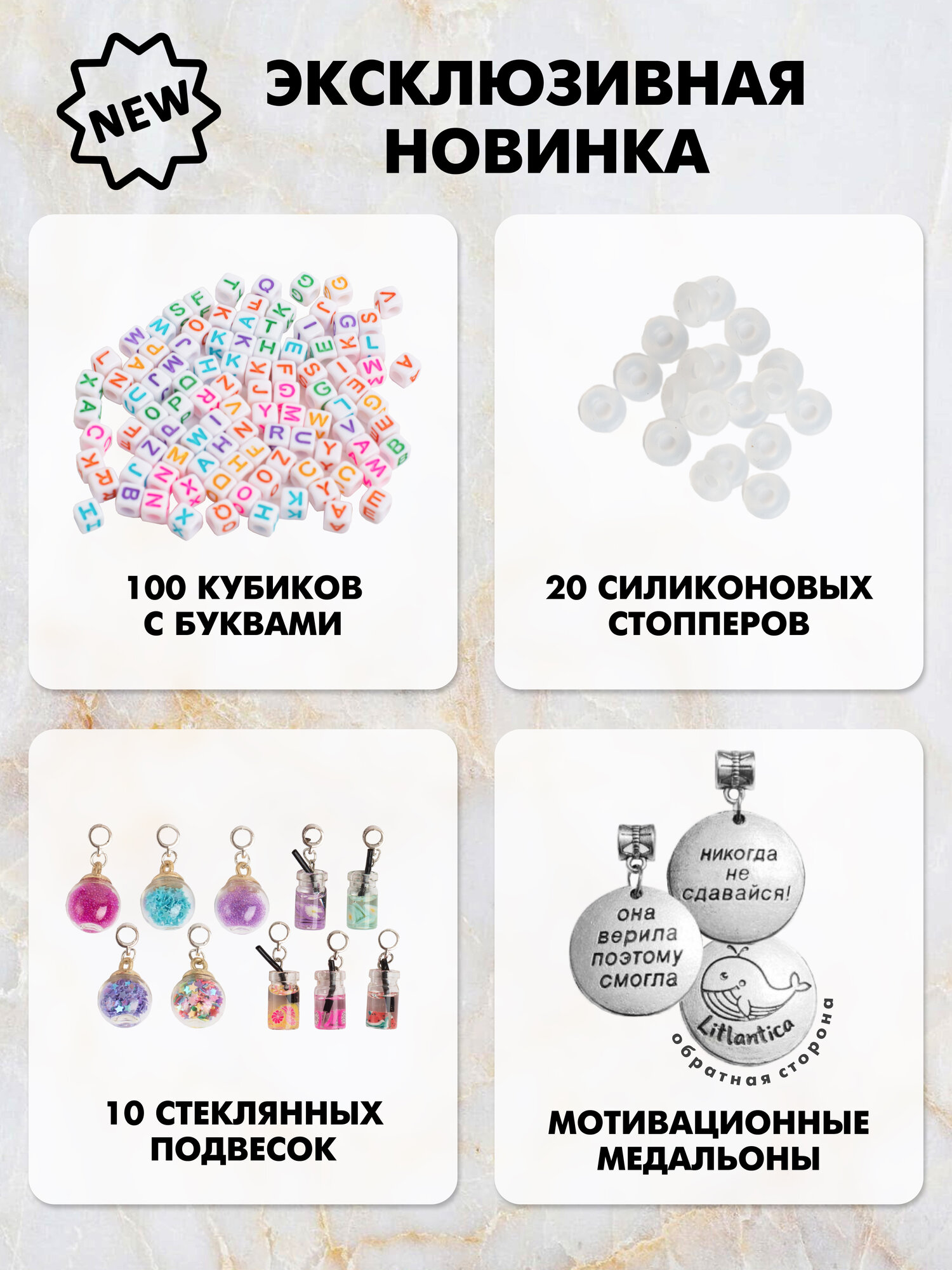 Набор для создания украшений, цвета радуги, 227 предметов (подарочный пакет, открытка, бусины с буквами, шармы, подвески). Новогодний подарочный набор для детей Litlantica Литлантика