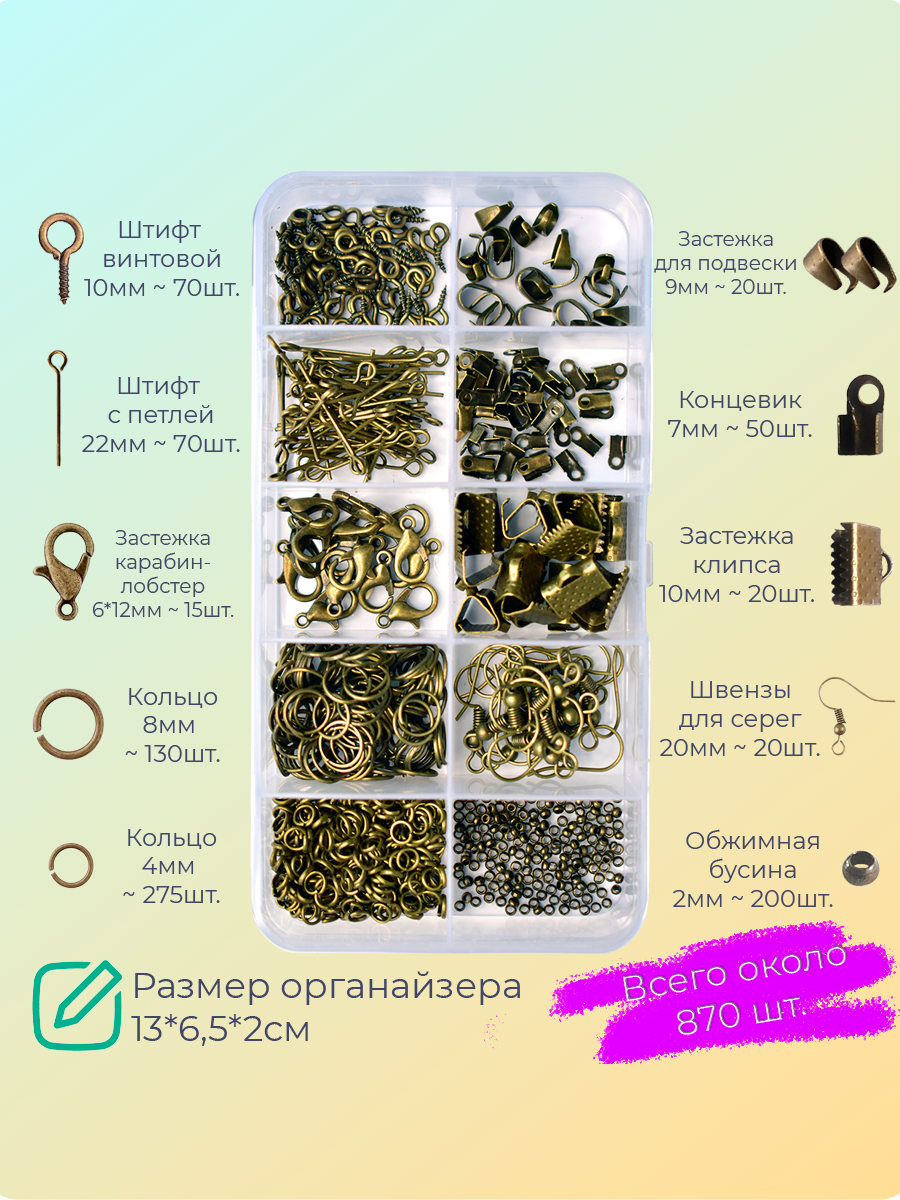 Купить Набор фурнитуры DKiSerg цвет бронза до 870 элементов с инструментами для создания украшений, органайзер на 10 ячеек