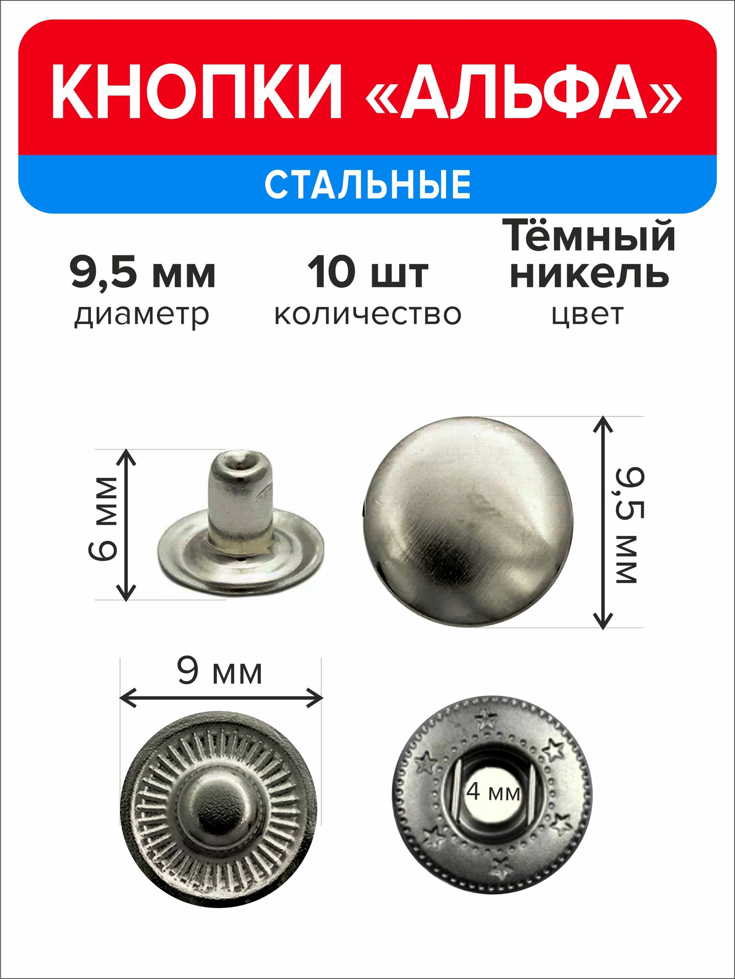 Кнопки "Альфа" 9,5 мм для одежды никель, 10 штук
