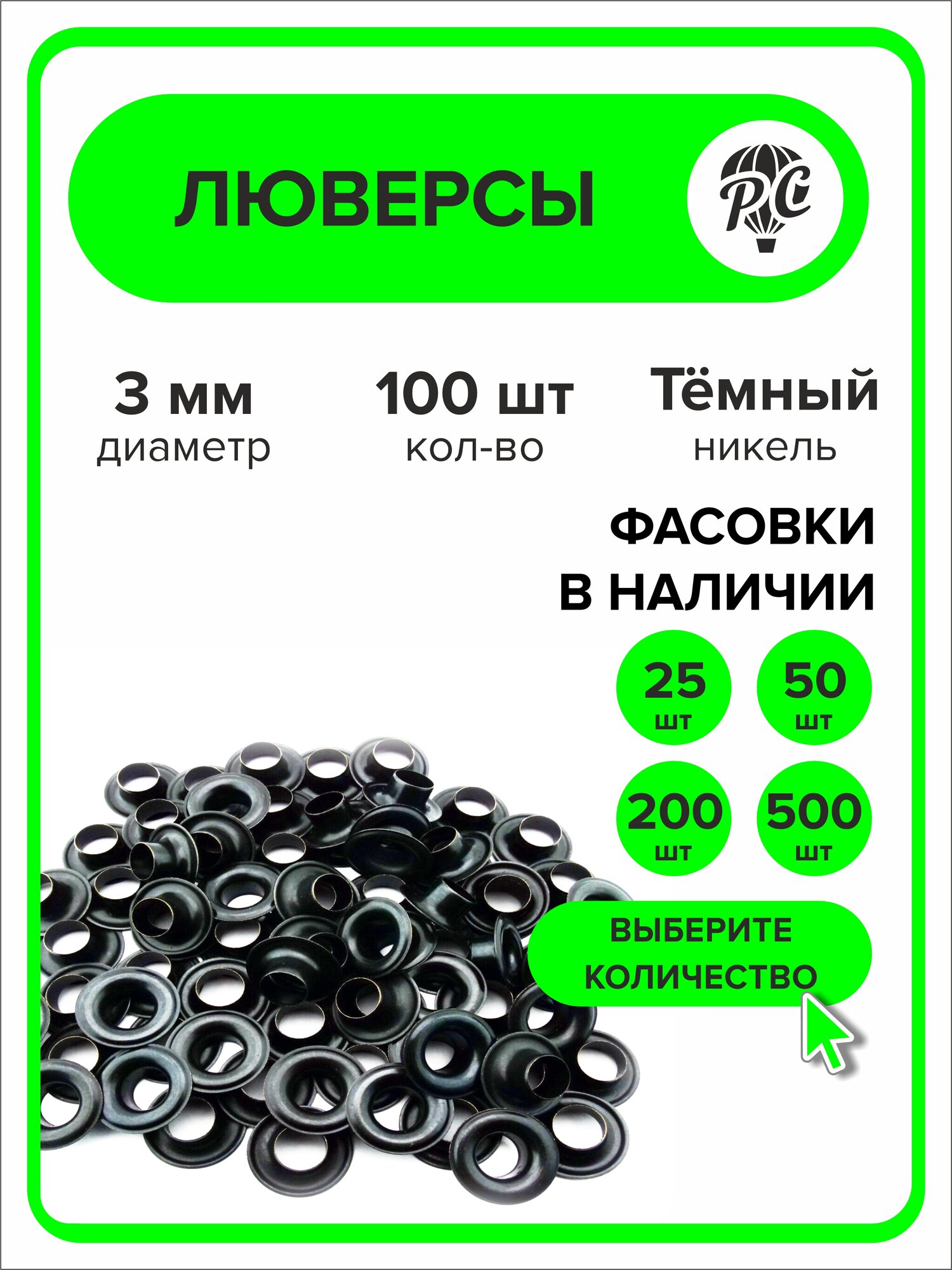 Купить Люверсы металлические 3 мм для одежды темный никель, 100 штук