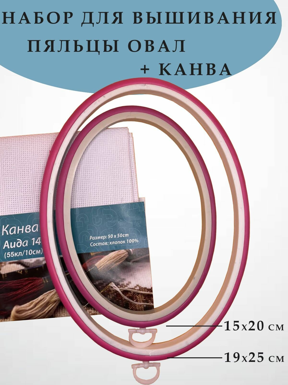 Купить Набор для вышивания: пяльцы овальные 2 шт. (15х20 см, 19х25 см.), канва 50х50 см.