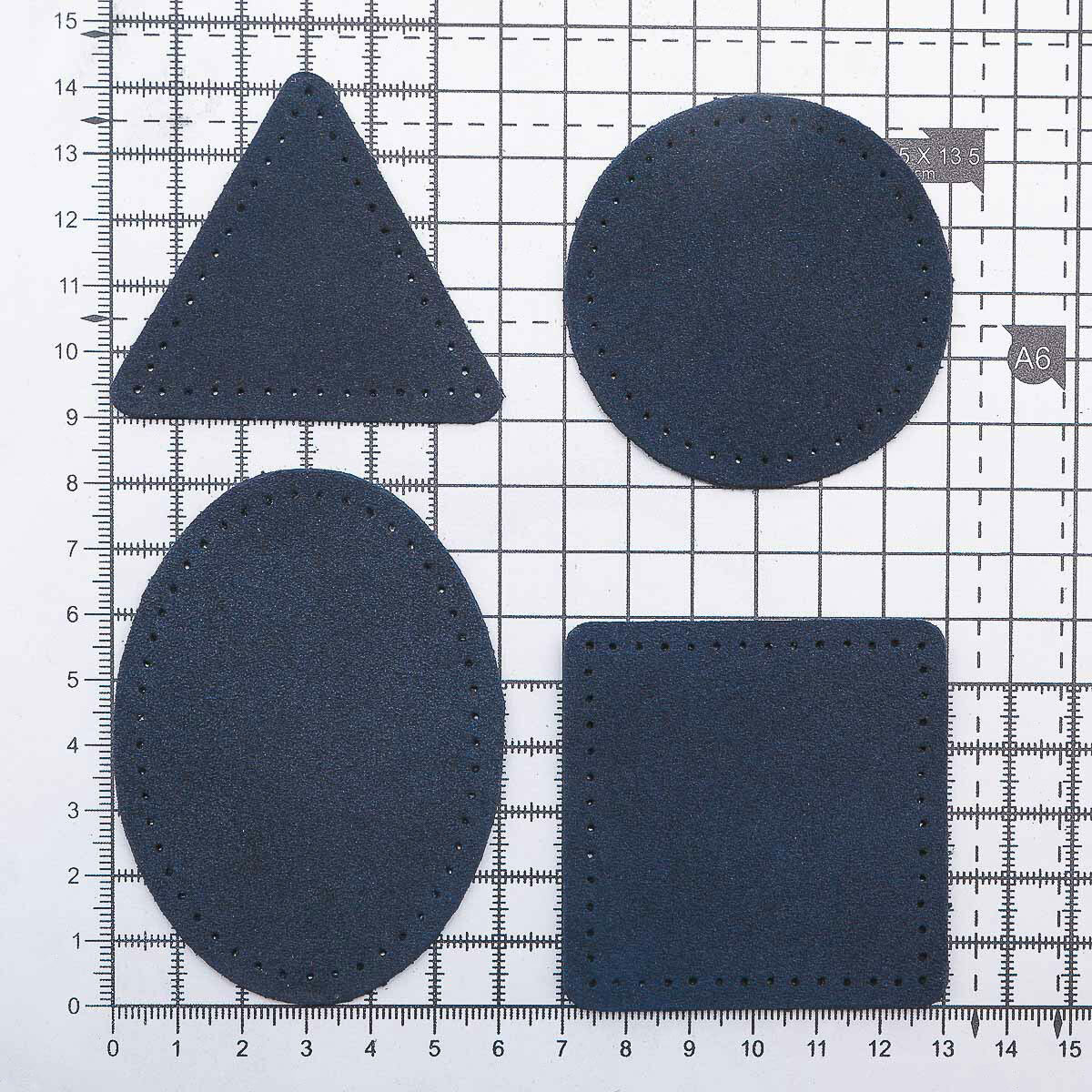 Купить 59723 Набор заплаток пришивных из замши, круг, квадрат, треугольник, овал 6см, с перфорацией, 4шт/уп (22 темно-синий)