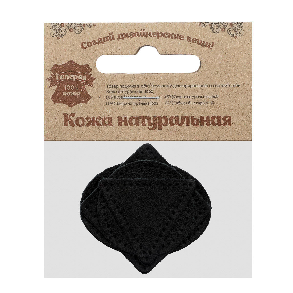 Купить 9723 Набор заплаток пришивных из кожи, круг, квадрат, треугольник, овал 6см, с перфорацией, 4шт/упак (01 черный)