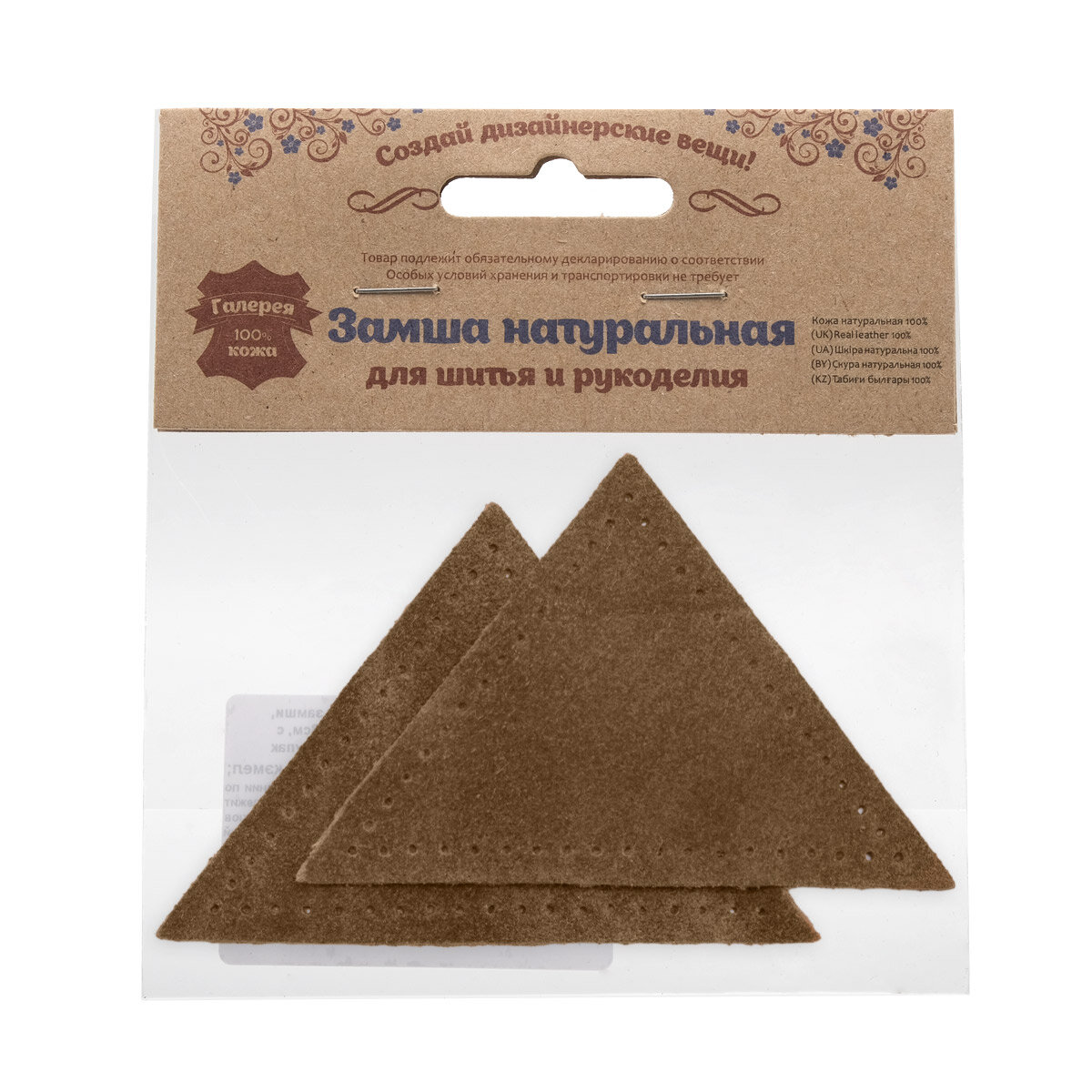 Купить 59903 Заплатки пришивные из замши, треугольник равнобедр, стор.8см, с перфорацией, 2шт/уп, 100%кожа (32 кэмел)