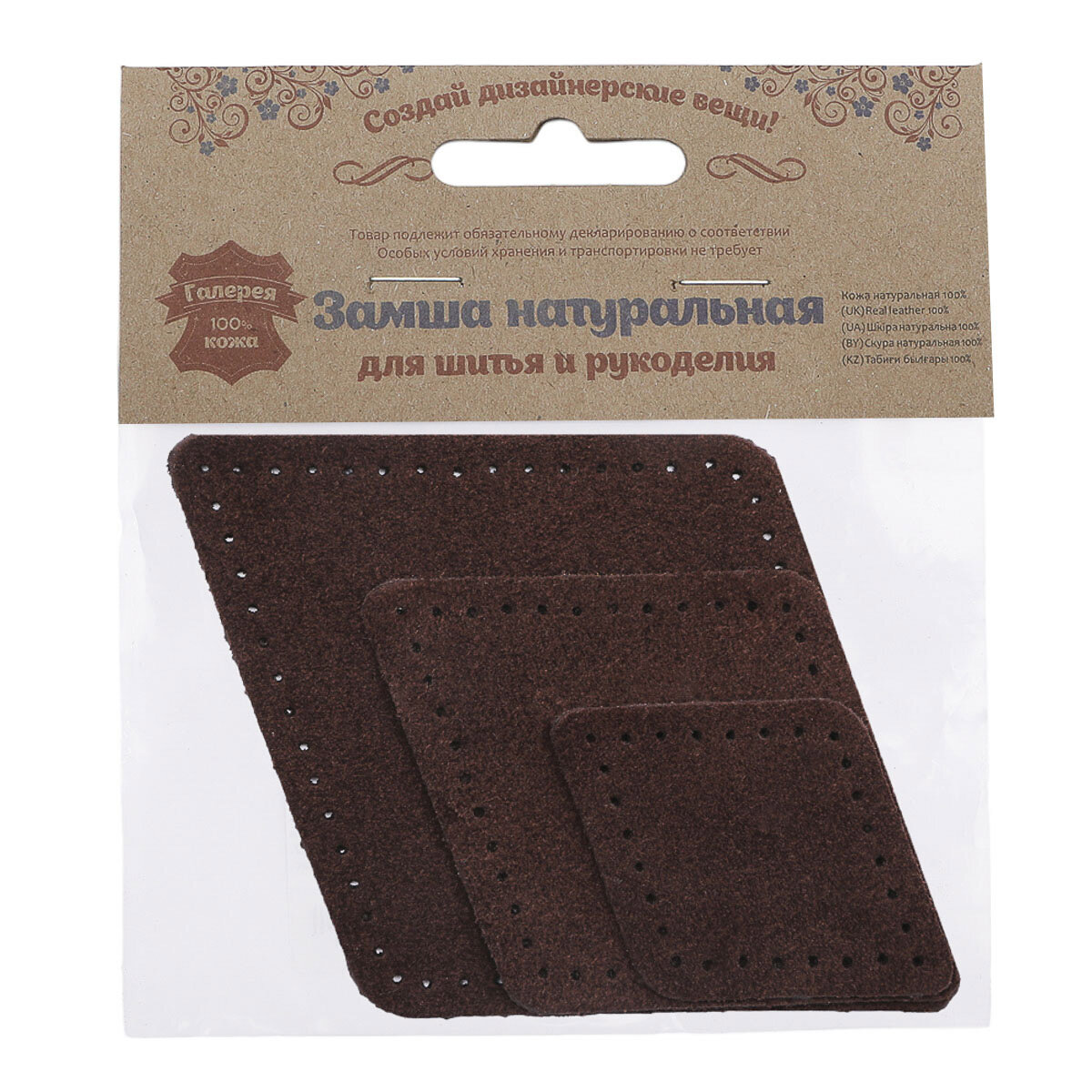 59402 Набор заплаток пришивных из замши, квадрат 4см, 6см и 8см, с перфорацией, 3шт/упак, 100% кожа (21 темно-коричневый)