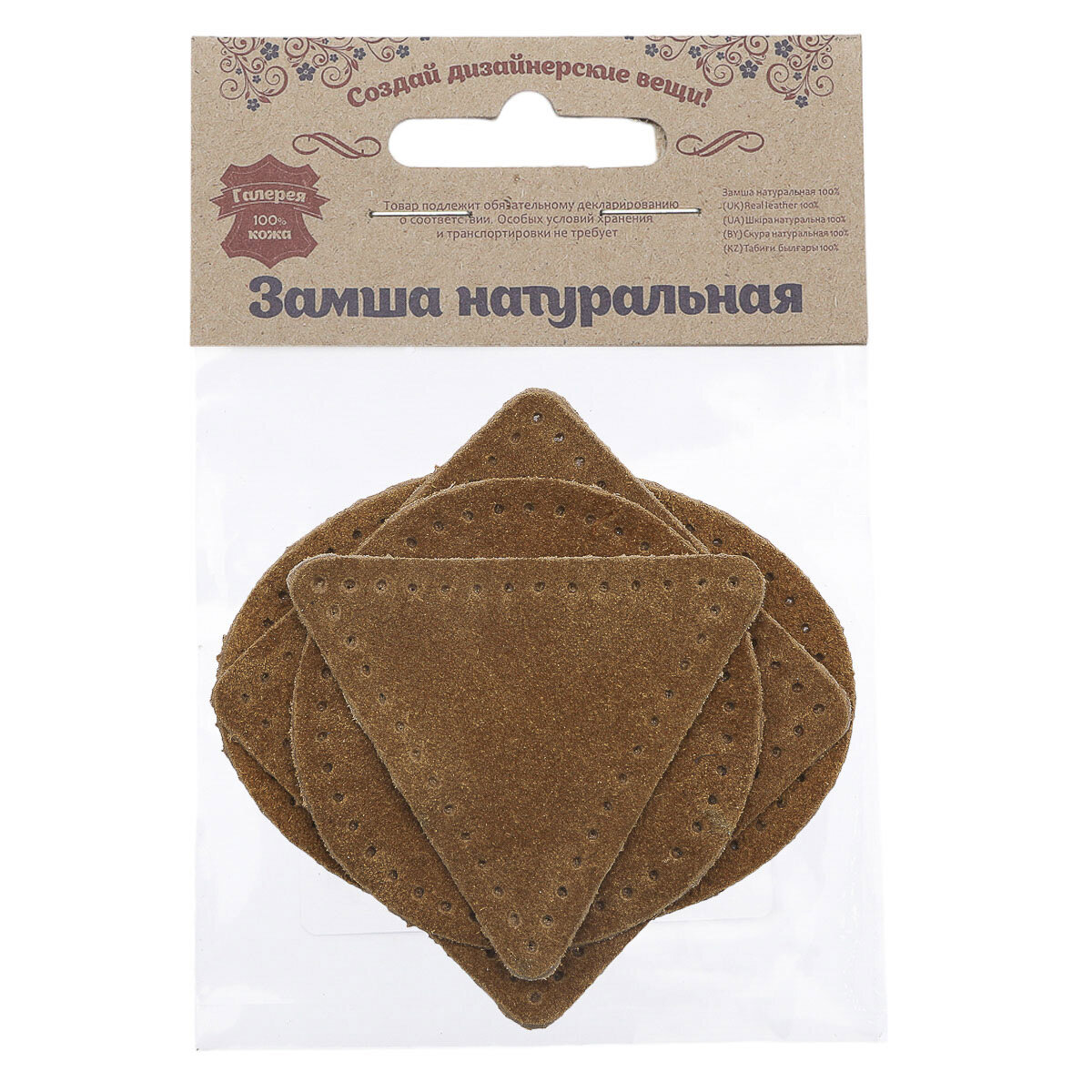 9723 Набор заплаток пришивных из кожи, круг, квадрат, треугольник, овал 6см, с перфорацией, 4шт/упак (02 светло-коричневый)