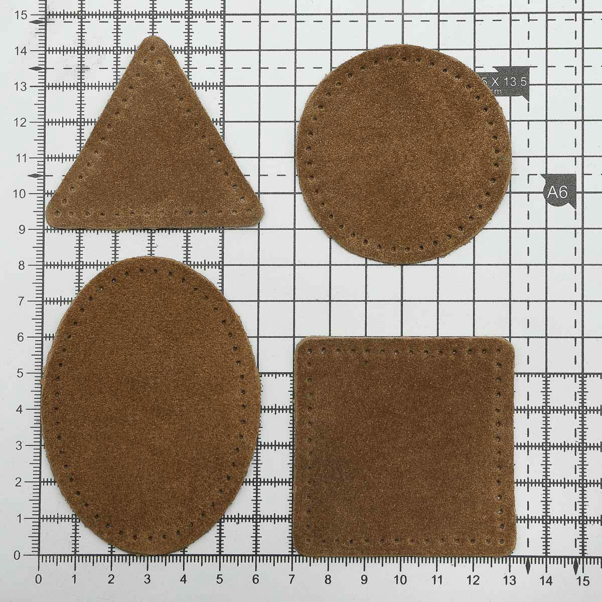 59743 Набор заплаток пришивных из замши, круг, квадрат, треугольник, овал 8см, с перфорацией, 4шт/уп (32 кэмел)