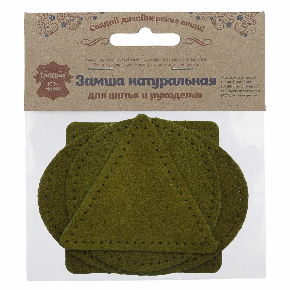 Купить 59743 Набор заплаток пришивных из замши, круг, квадрат, треугольник, овал 8см, с перфорацией, 4шт/уп (33 хаки)