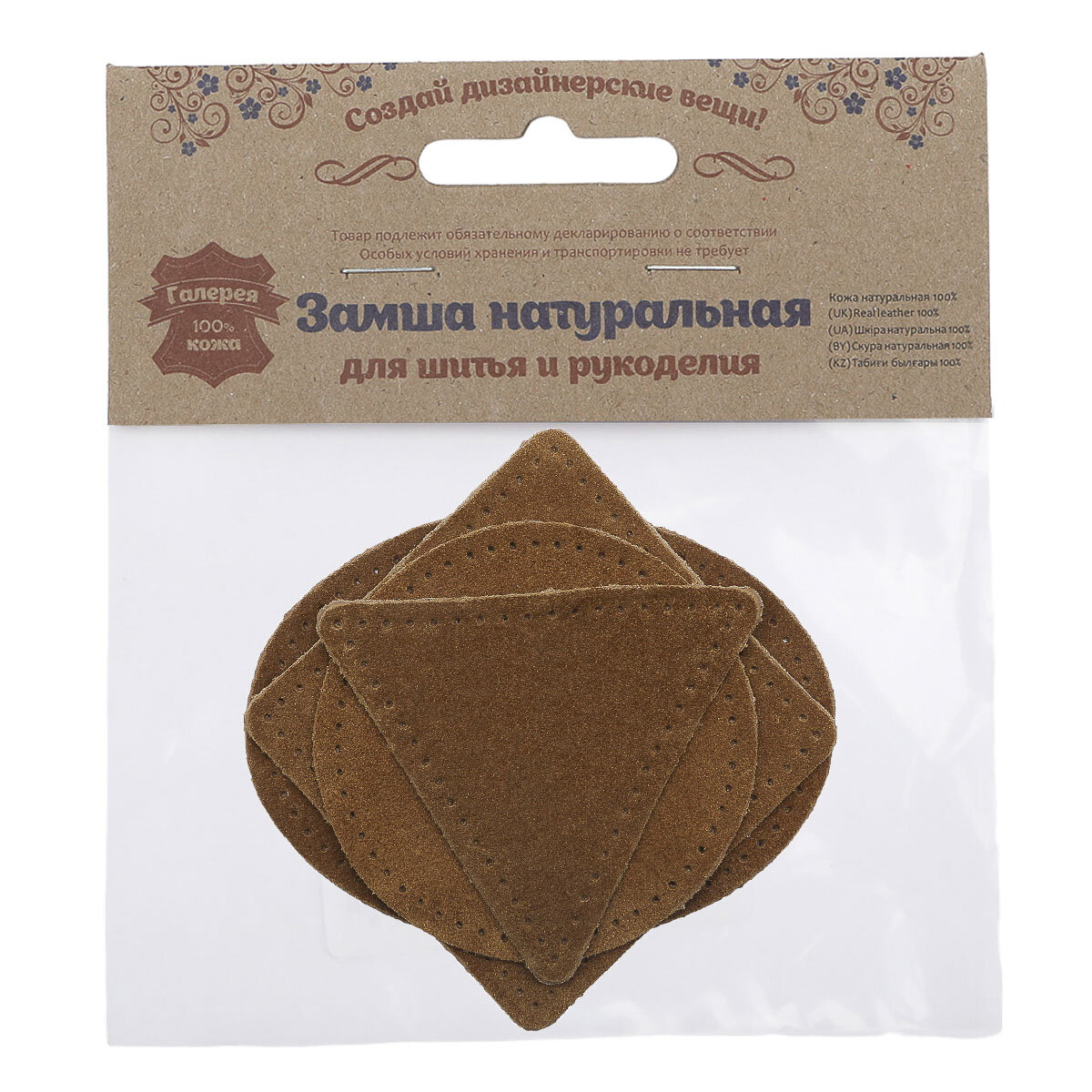59723 Набор заплаток пришивных из замши, круг, квадрат, треугольник, овал 6см, с перфорацией, 4шт/уп (32 кэмел)
