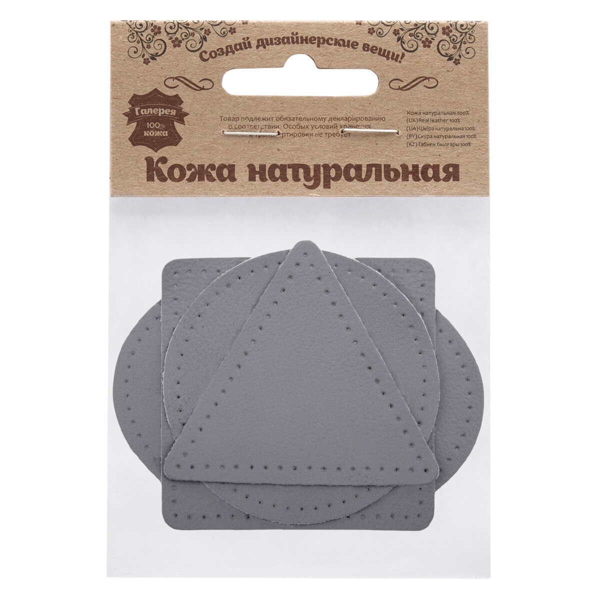 9723 Набор заплаток пришивных из кожи, круг, квадрат, треугольник, овал 6см, с перфорацией, 4шт/упак (07 серый)