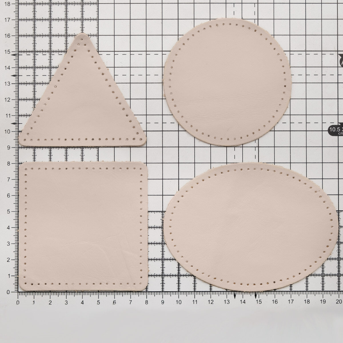 Сохранить9743 Набор заплаток пришивных из кожи, круг, квадрат, треугольник, овал 8см, с перфорацией, 4шт/упак (06 бежевый) интересное: